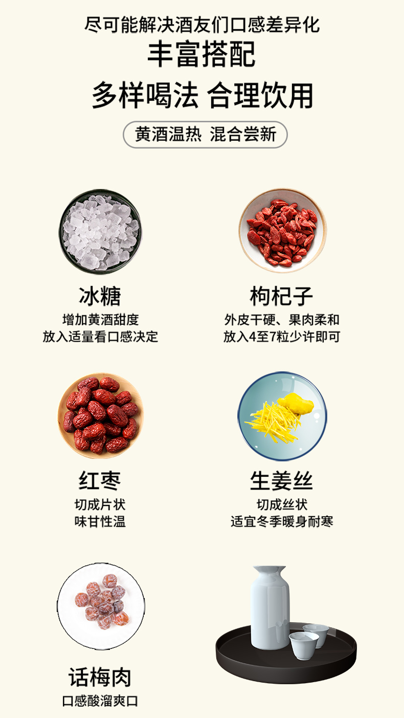 黄酒含丰富的蛋白质,酒中的蛋白质经微生物酶的降解,绝大部分以肽和氨基酸的形式存在,易为人体吸收利用。黄酒中还含多酚物质、功能性低聚糖肽、谷胱甘肽、有机酸、维生素、矿物质等营养物质。