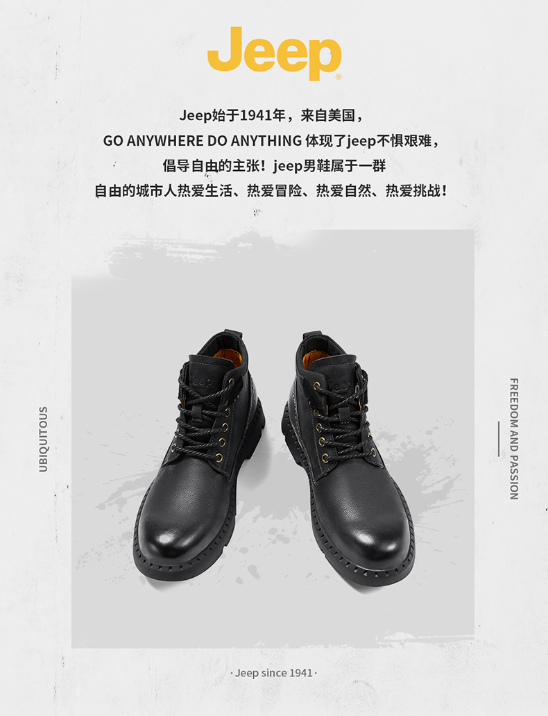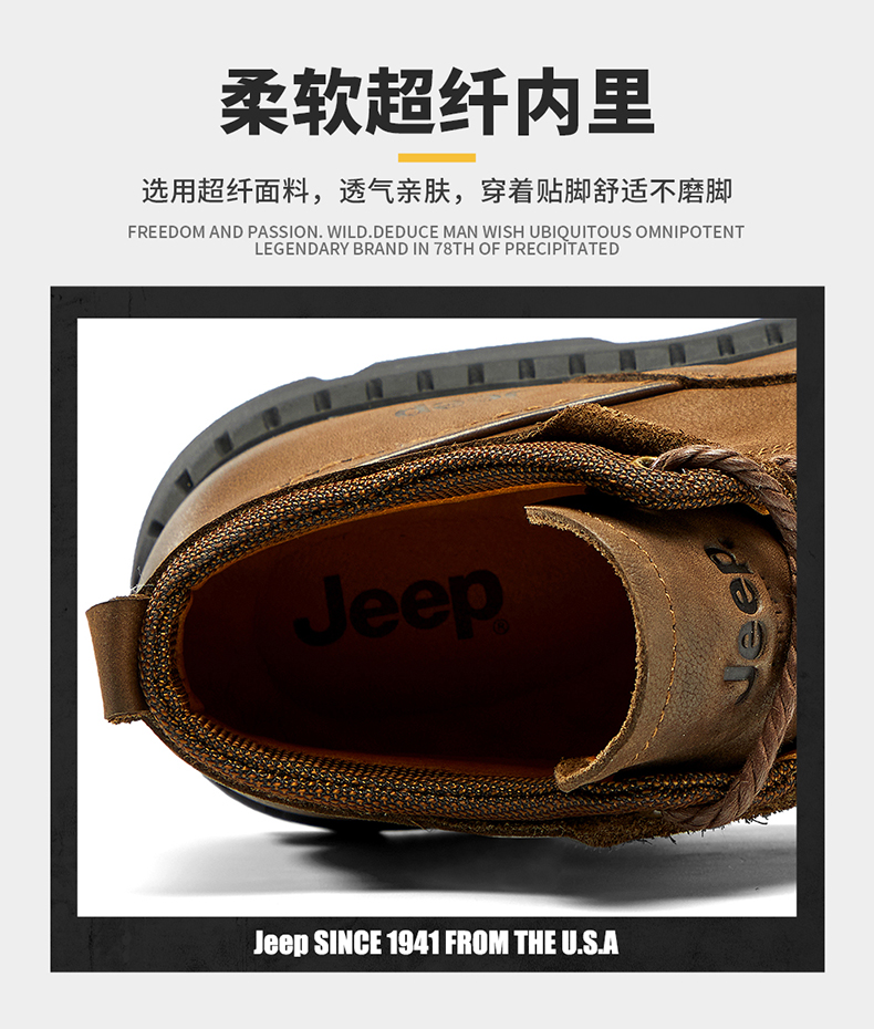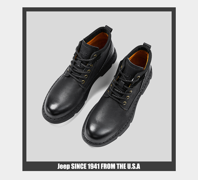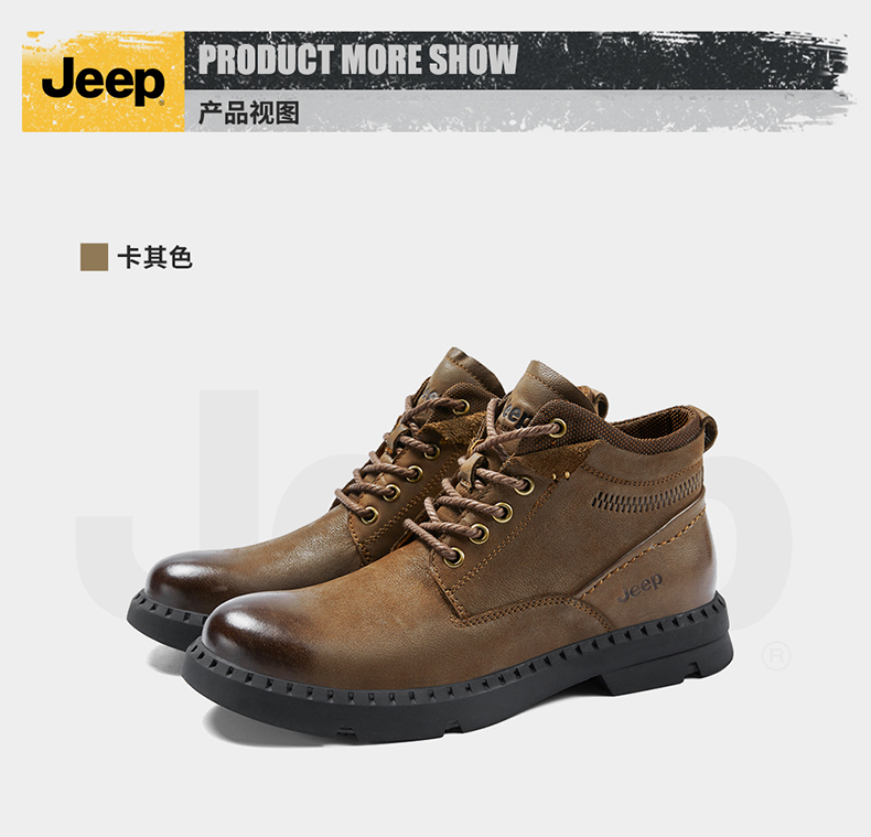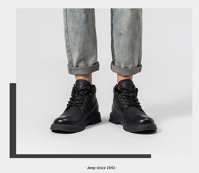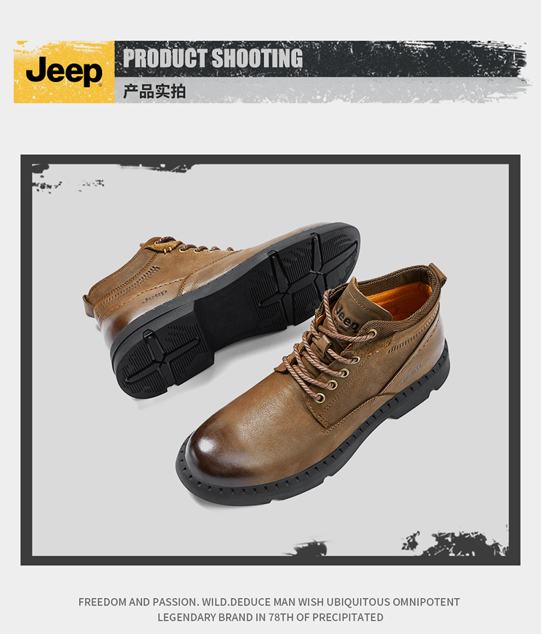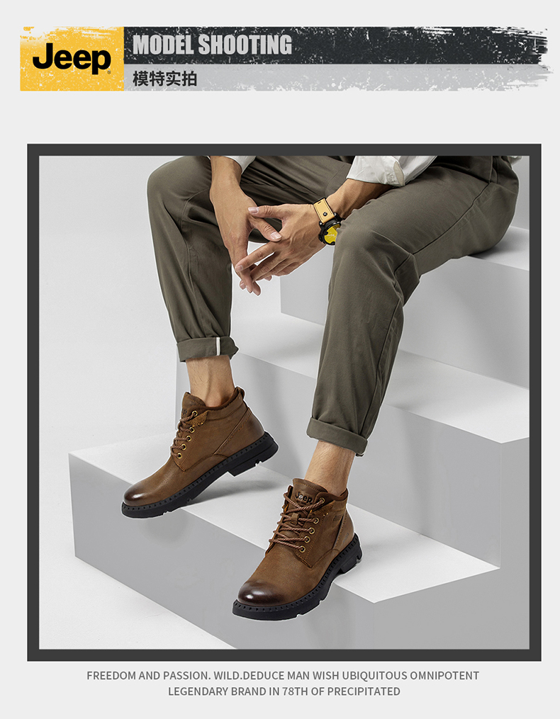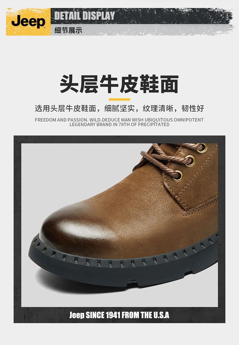 这款吉普 Jeep 男英伦复古马丁靴,鞋面使用头层牛皮,纹理清晰细腻,摸着坚实韧性好。柔软超纤内里,亲肤透气,穿着贴脚舒适不磨脚。轻质RB鞋底,轻便缓震,脚感不错。