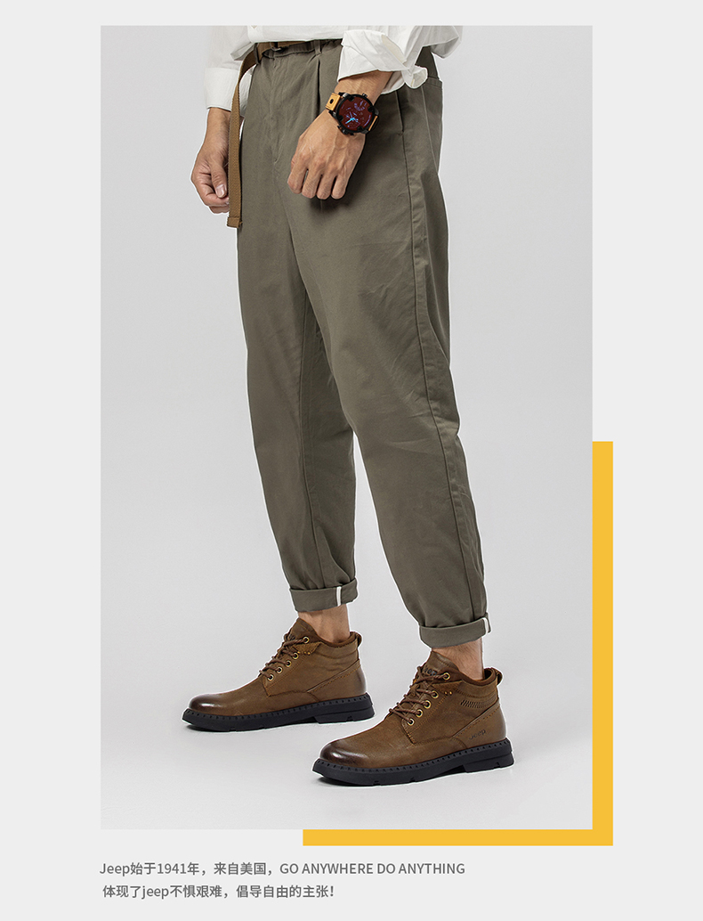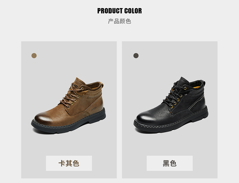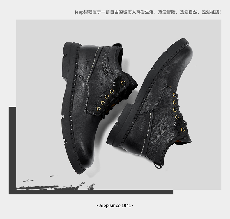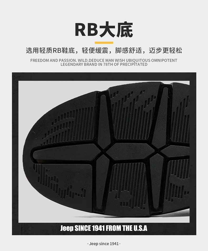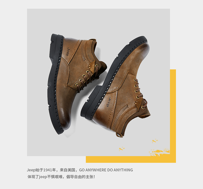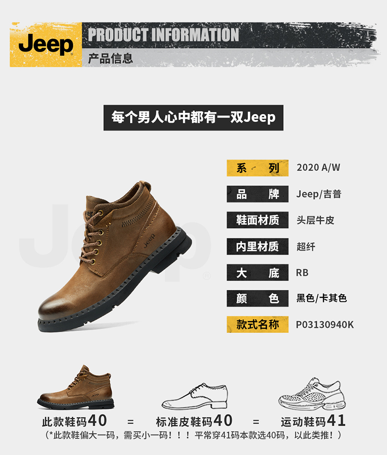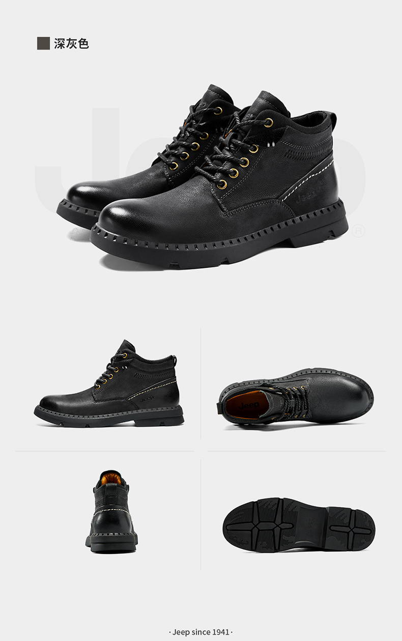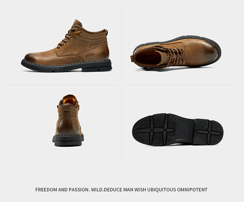 这款吉普 Jeep 男英伦复古马丁靴,鞋面使用头层牛皮,纹理清晰细腻,摸着坚实韧性好。柔软超纤内里,亲肤透气,穿着贴脚舒适不磨脚。轻质RB鞋底,轻便缓震,脚感不错。