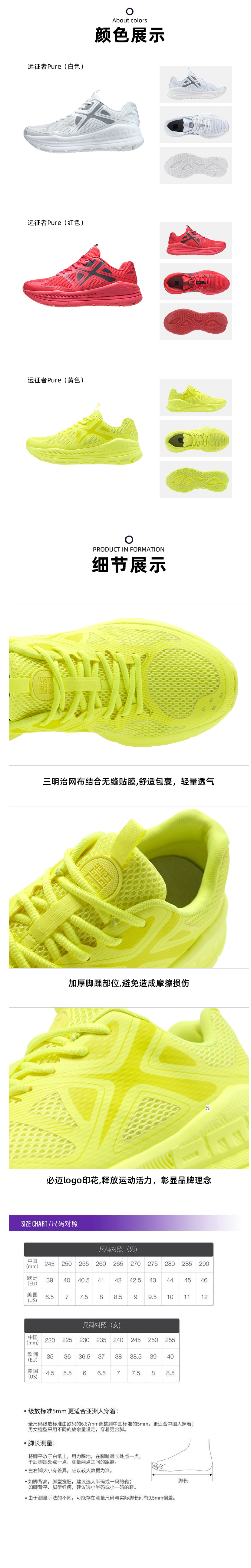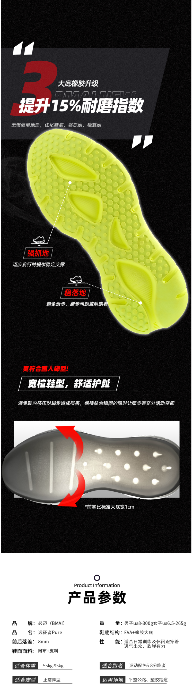 这款必迈远征者Pure是2021年的秋季新款,专为大体重人士设计/适合55~95kg的朋友,独家的厚底结构,缓震中底比平常跑鞋厚约1cm,可有效保护膝盖,是一款拥有强缓震的长距离护膝性慢速跑步鞋。