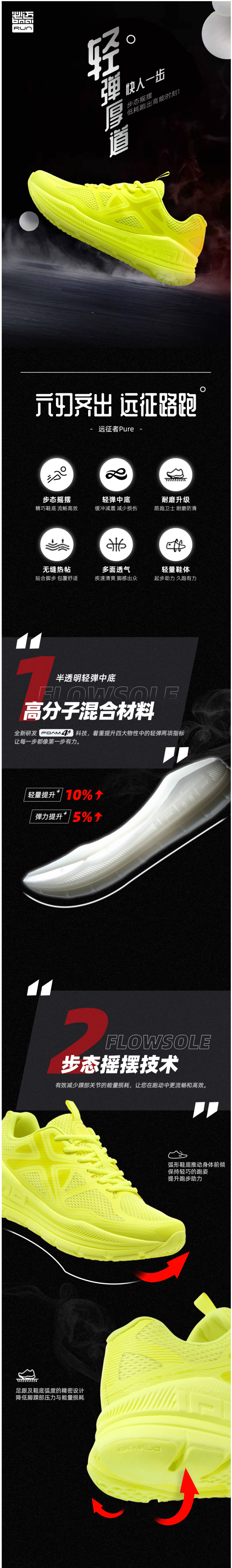 必迈Pure远征者,是为大体重用户设计的长距离慢跑鞋,使用由超轻配方EVA缓震材料制成的FOAM 4全新科技中底,中底全掌比平常跑鞋厚约1cm,提供轻量优秀的缓震性能,大大缓解了膝盖与脚踝压力。