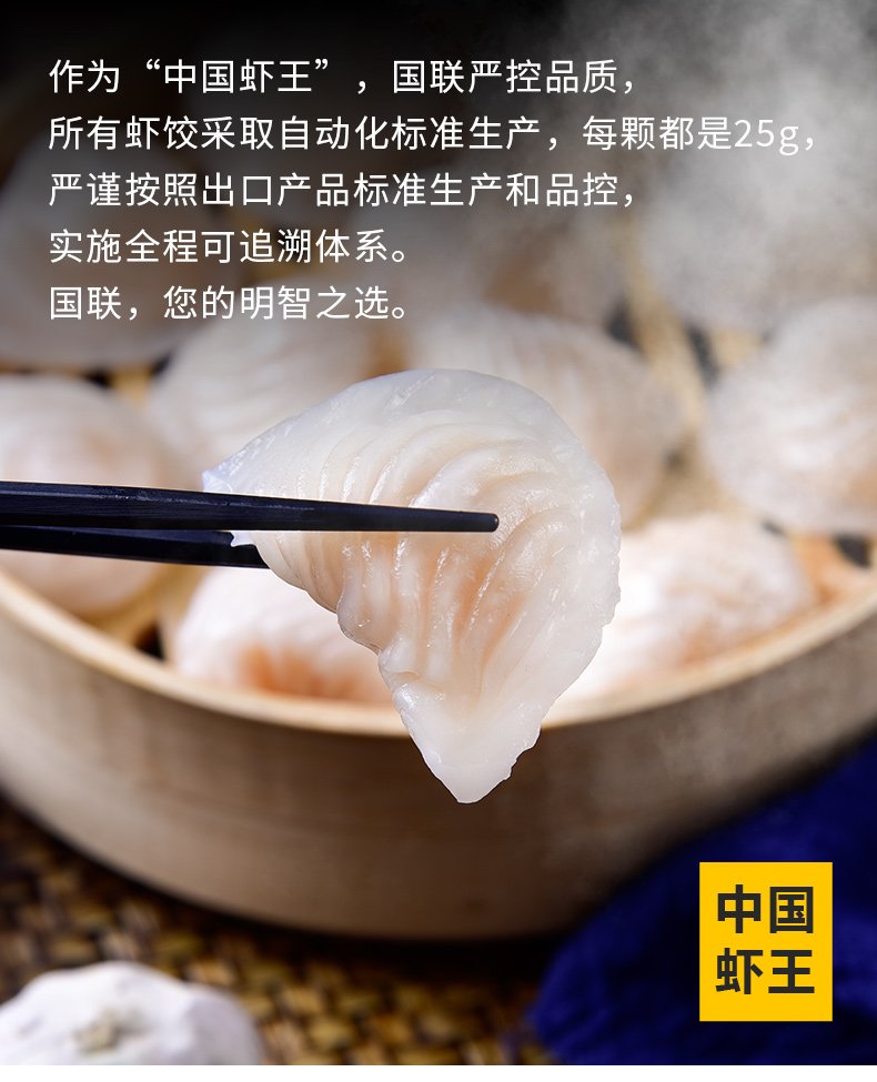 这款 广东港式水晶虾饺皇,上市公司国联水产(股票代码3000)出品,按照出口产品标准生产,实施全程可追溯体系,品质有保障。严选南美整只白对虾仁,新鲜冬笋和优质澄粉制作,饺皮晶莹剔透,皮薄软韧,可清晰看见内里封堵的馅料,味道鲜美爽滑。