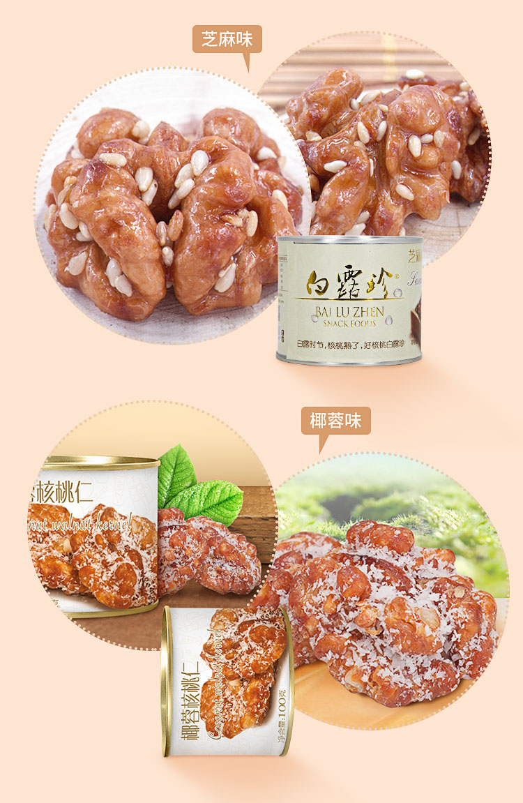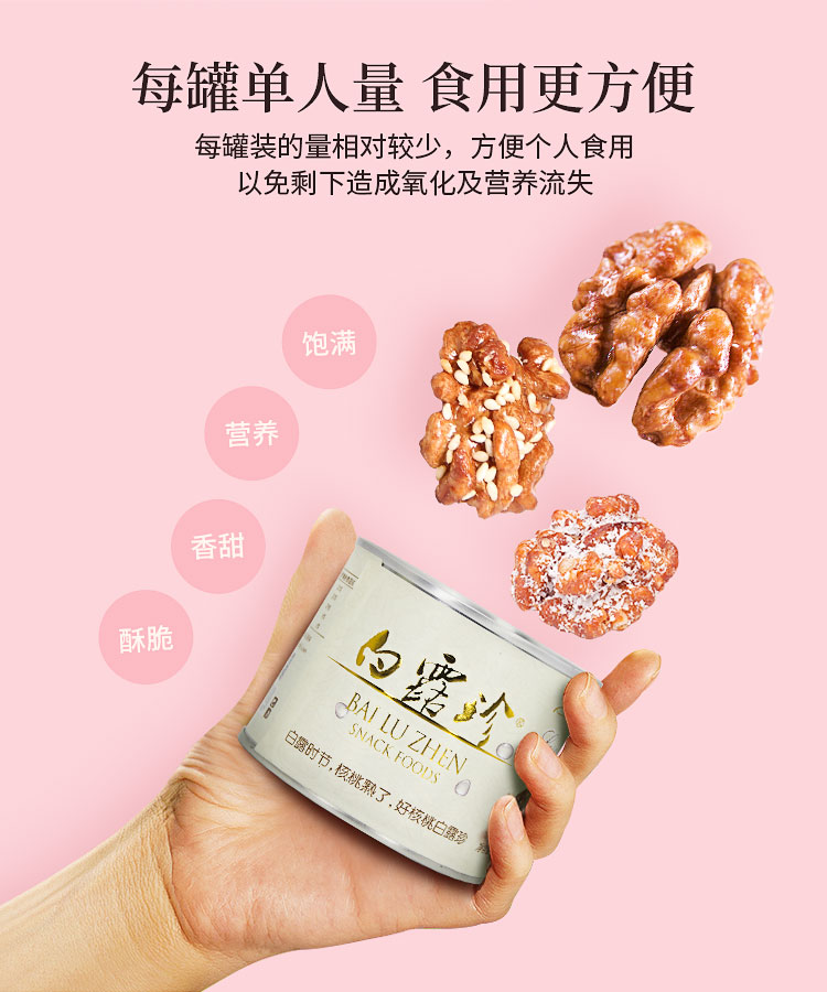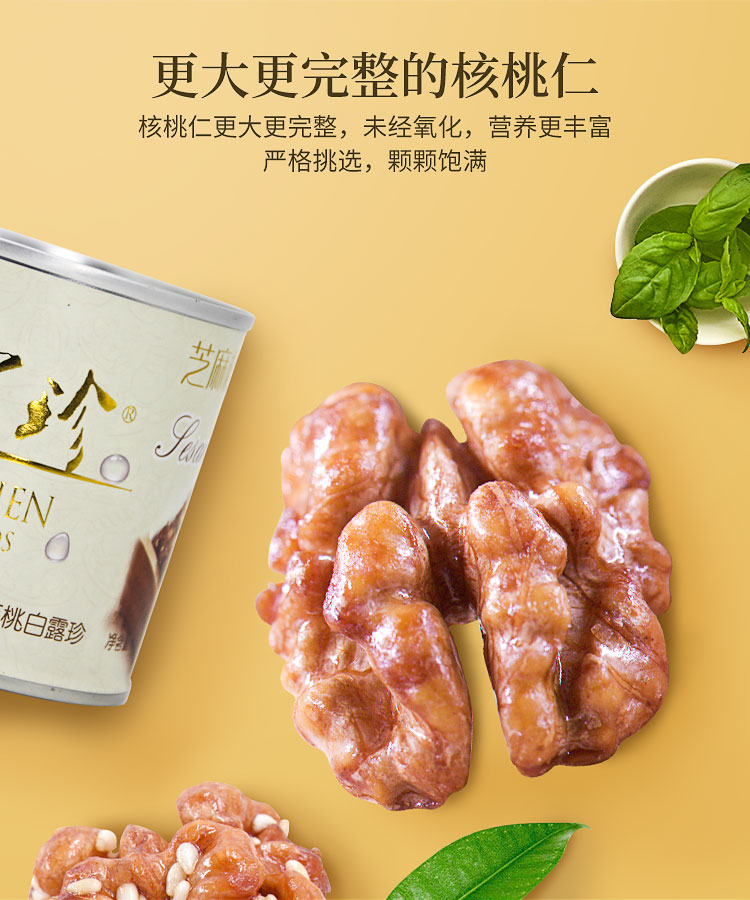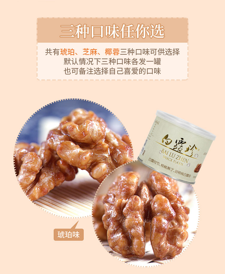 白露珍琥珀核桃仁,精选太行山核桃,果仁饱满,外层包裹着一层糖浆,色泽红润油亮,中和核桃的苦味,入口甘甜酥滑,不添加添加剂和防腐剂,健康营养小零食。有琥珀、芝麻2种口味,可随意选择。