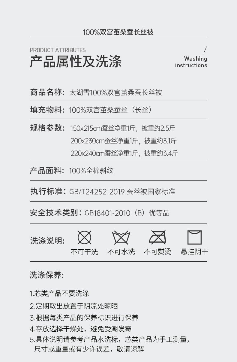 此款蚕丝被填充的是桑蚕丝中顶级的双宫茧蚕丝,因为产量稀少,价格相对高一些。产自苏州核心产地太湖雪自有种植园,纤维长度单茧可达1000米长度,不管是蓬松度和舒适度都远超普通蚕丝,保暖度和寿命都很高。全过程无污染拉网制被工艺,通过选蚕、铺层、定位、质检等层层审核制作而成,具有轻、柔、细的特点。
