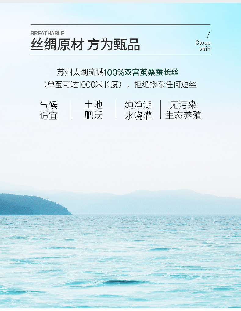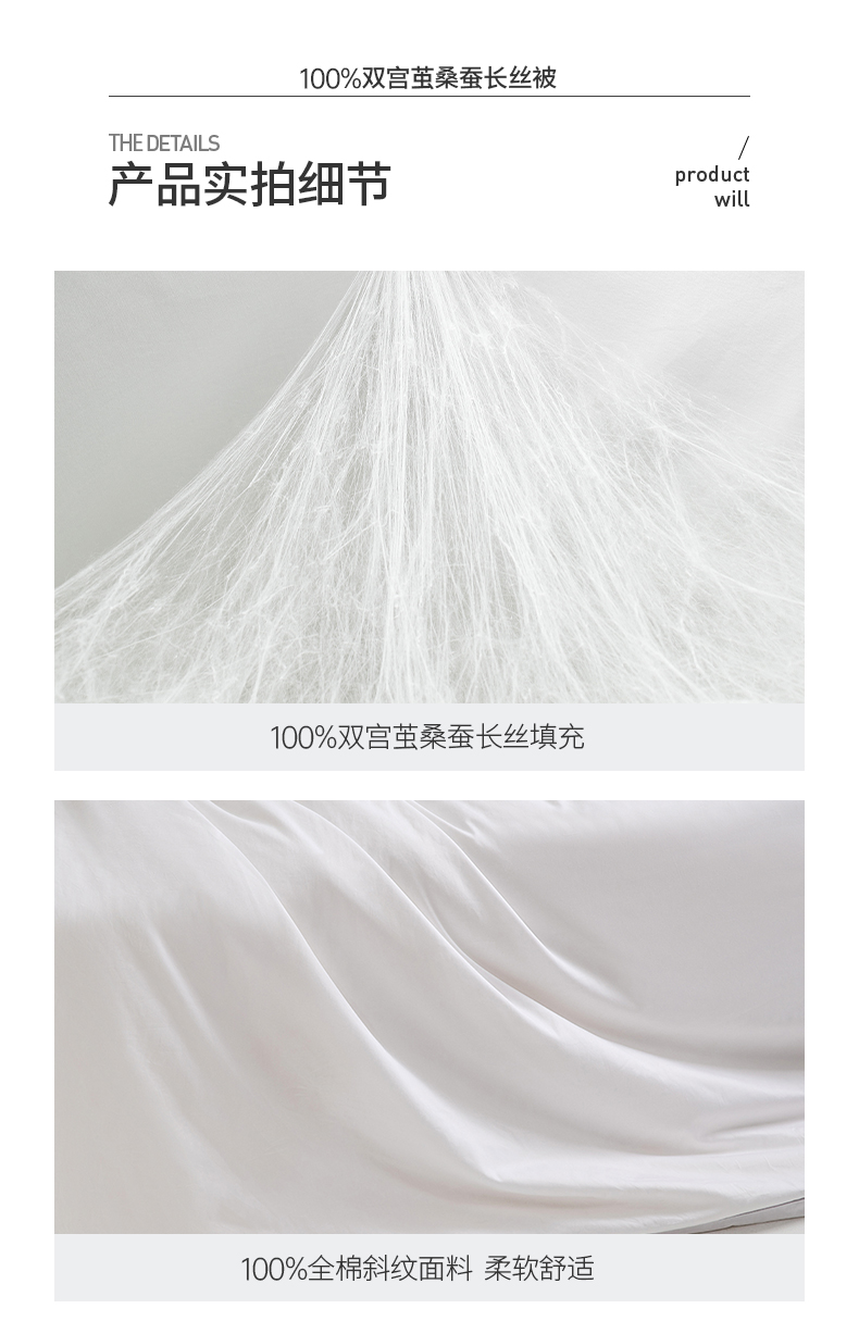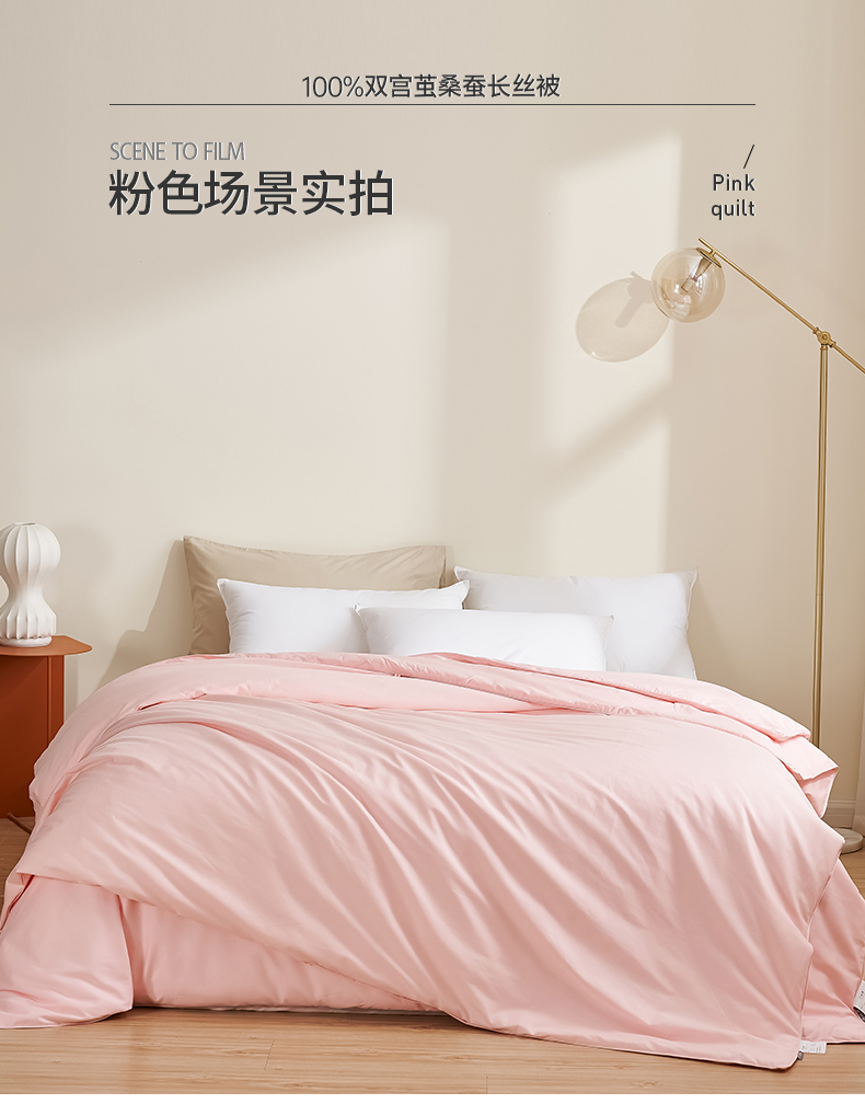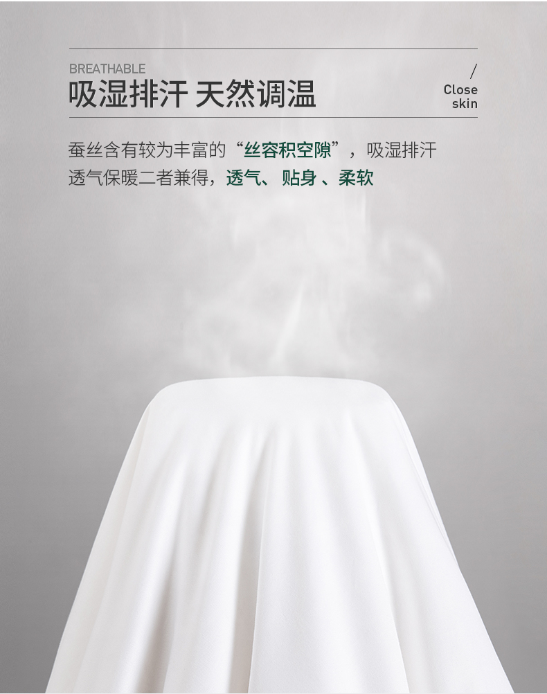 蚕丝具有“纤维皇后“之美誉,天热的适合舒适透气,天冷的时候保暖;桑蚕丝含有的氨基酸,因为和人体皮肤接近,对皮肤还有保养功效。在好的亲肤性、舒适性、保暖性的前提下,不管是对于婴幼儿,还是对于老人、成人的睡眠而言,都能提升不少质量。