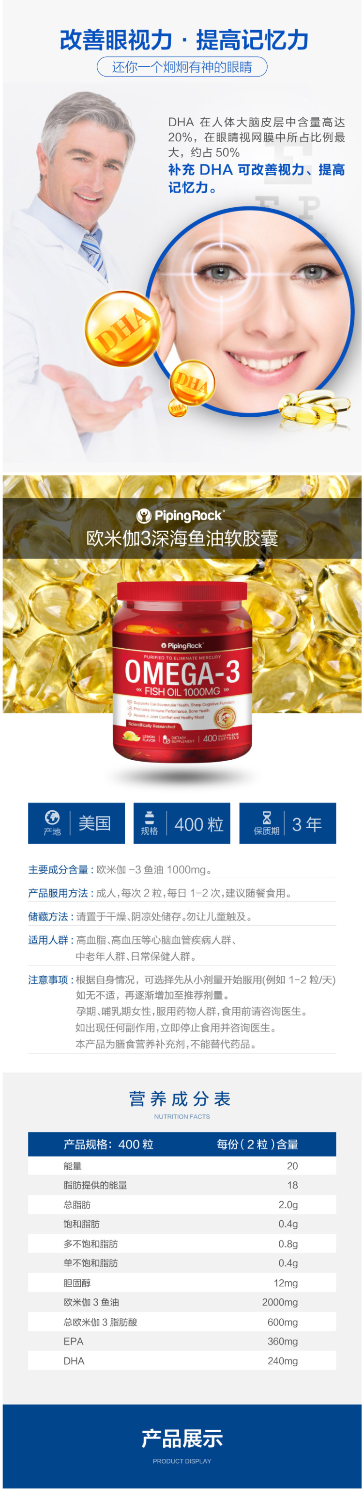 这款 PipingRock Omega3 深海鱼油软胶囊 8倍浓缩,每粒含欧米伽3鱼油1000mg,含有丰富的DHA和EPA,在改善心脏健康方面效果明显。适用于中老年、高血压、高血脂等心脑血管疾病的人群,还可辅助调节肝功能,改善视力,提高记忆力。
