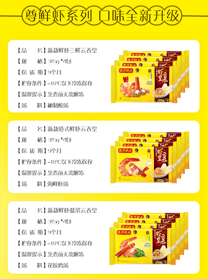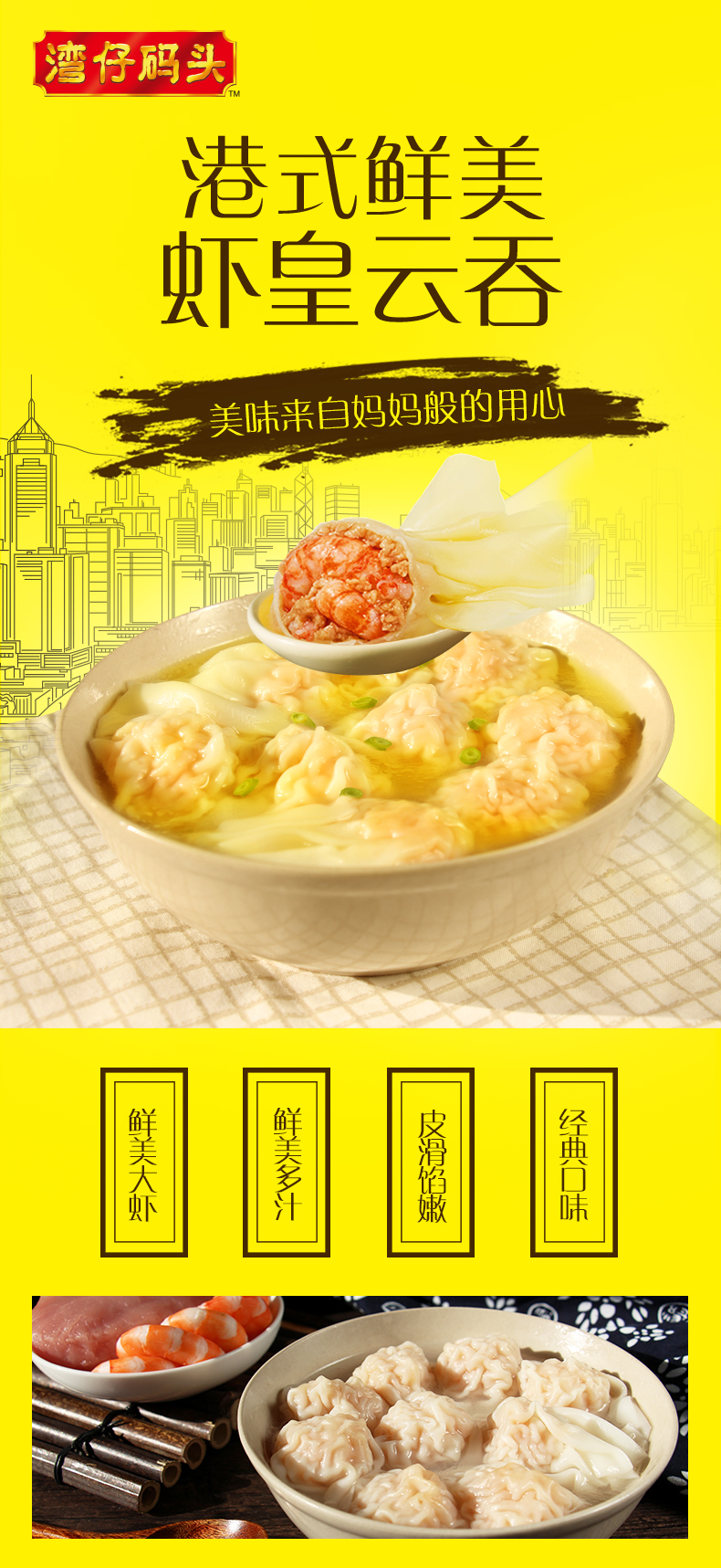 "湾仔码头”是一个速冻食品品牌,属于美国通用磨坊食品公司。创始人臧健和女士最初是在香港湾仔码头边摆地摊卖水饺起家的。这款湾仔码头 港式鲜虾云吞皇,采用特有的真空和面技术,面皮Q弹不易破,鲜美大虾口味,满满的都是虾仁,港式风味,口感鲜香顺滑。