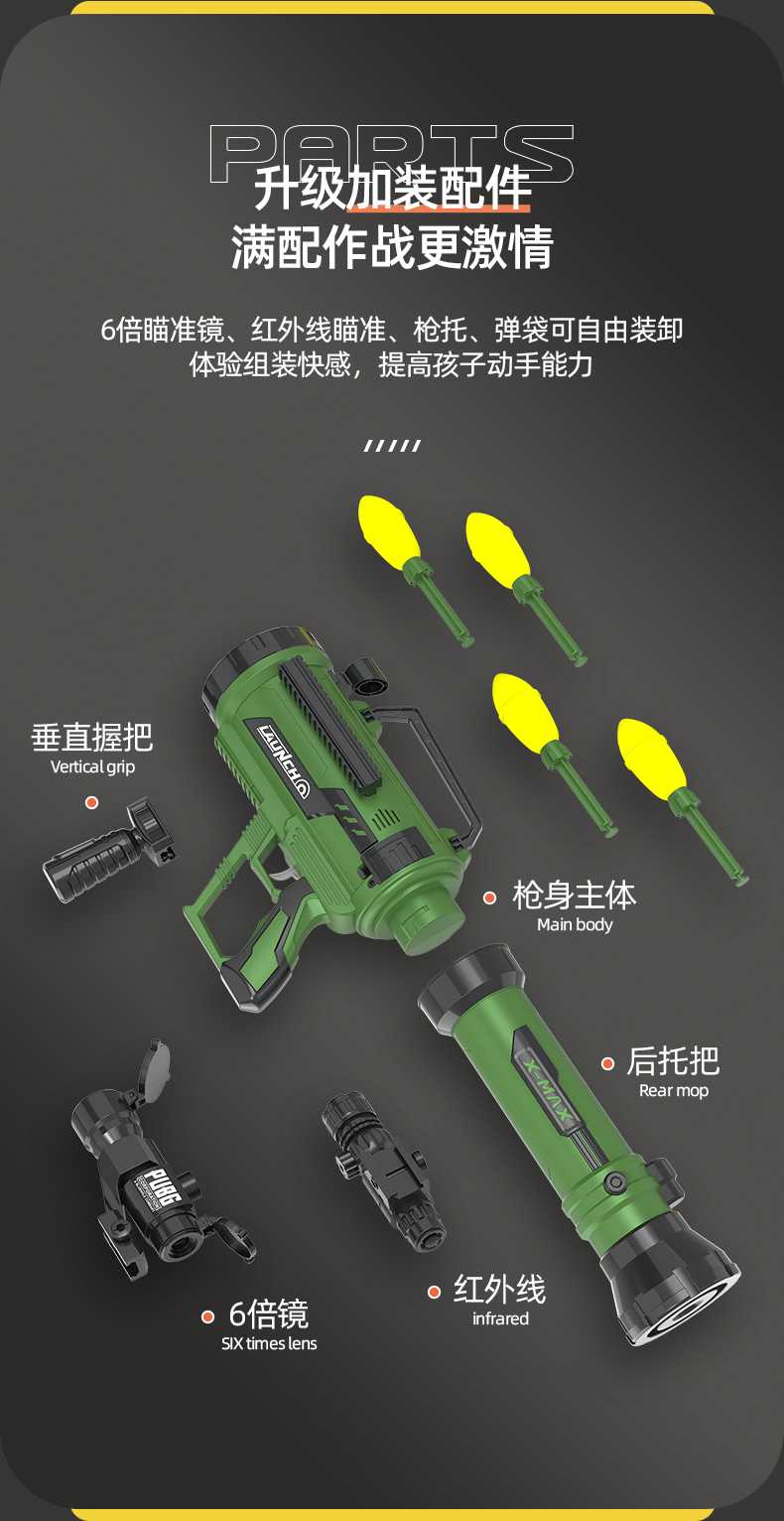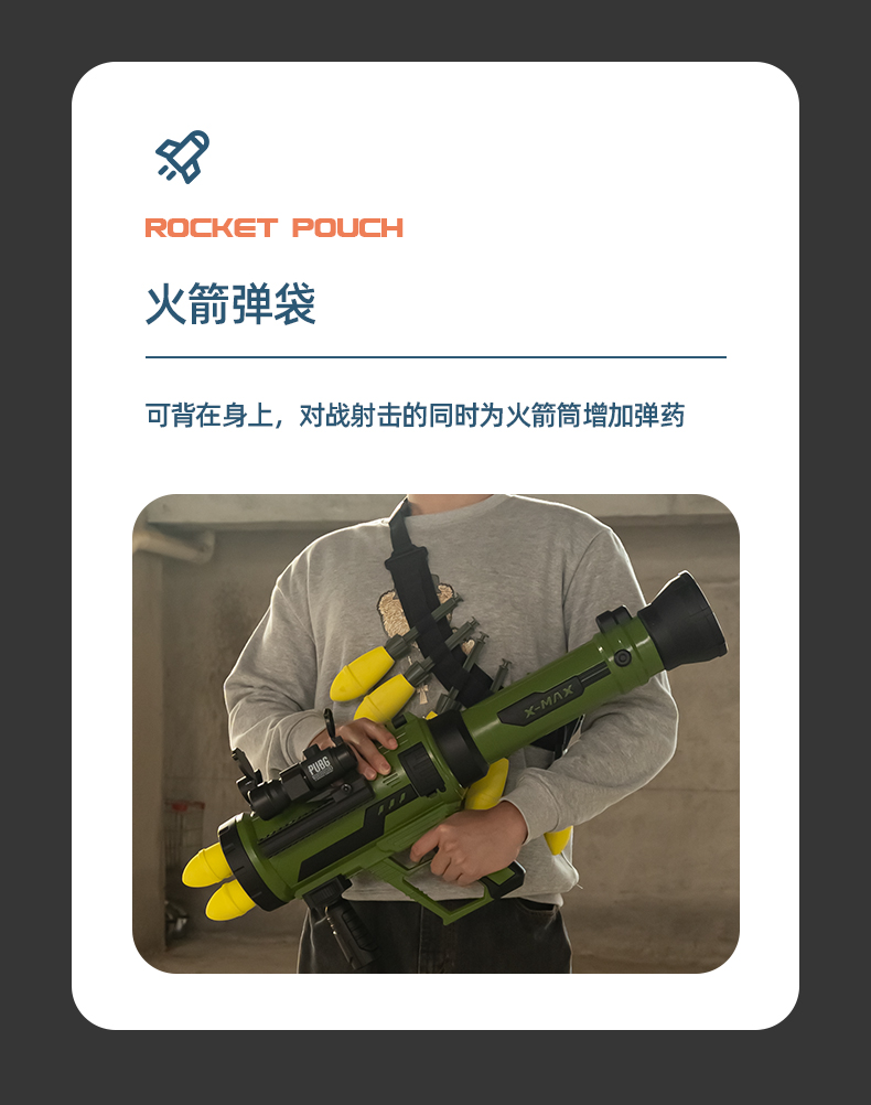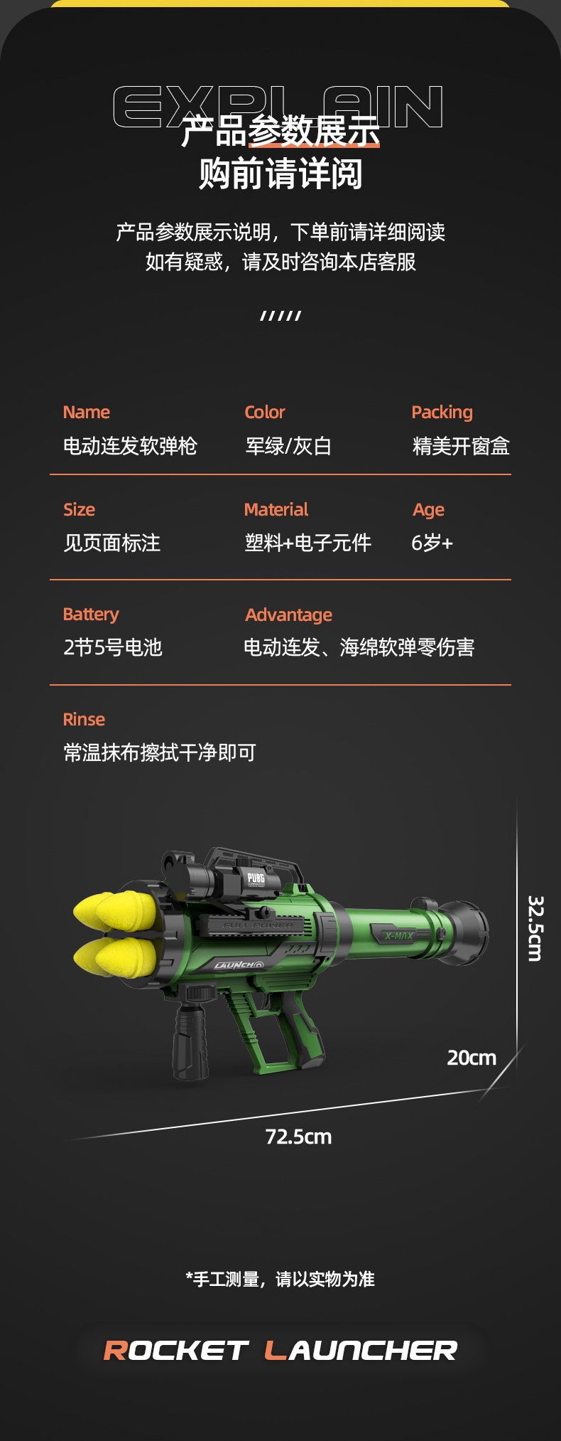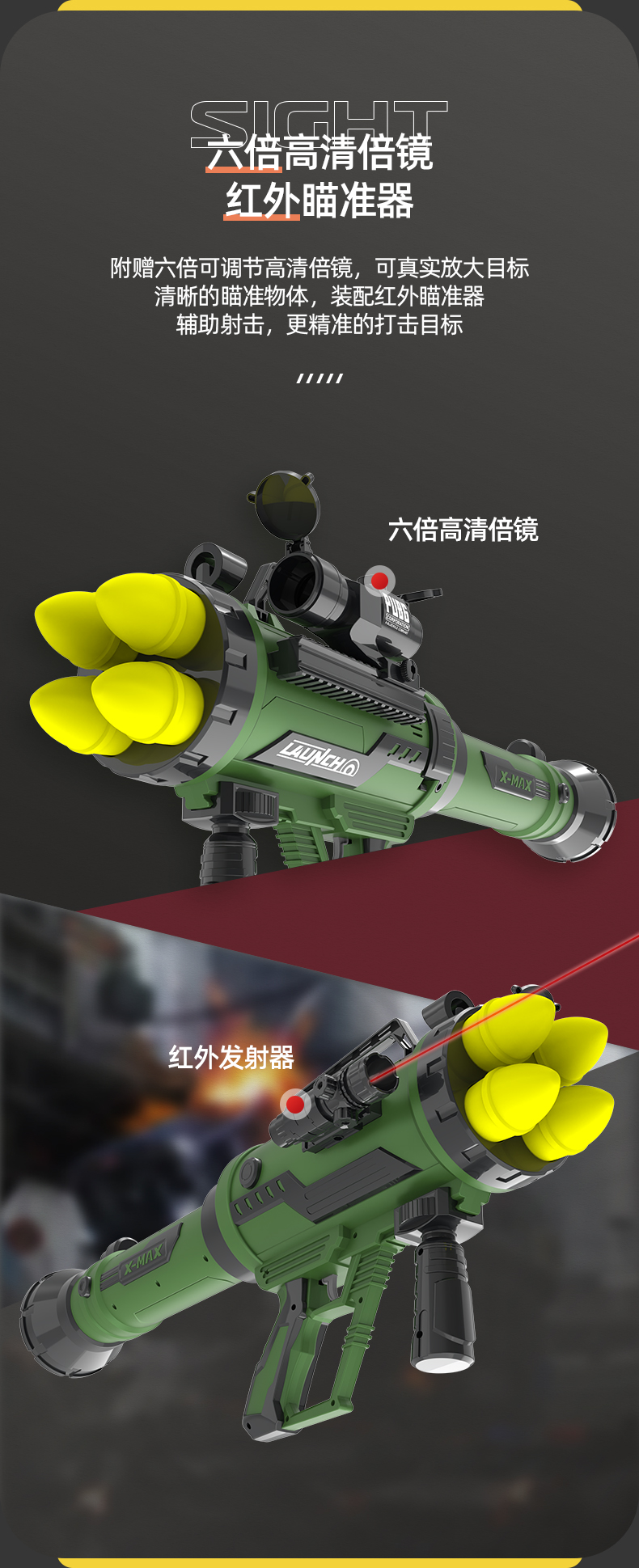 火箭炮欢乐对战,环保绵软弹0伤害,可调倍镜,红外发射器,射程6米左右,内置多种射击音效,增加游戏气氛。耐摔耐打,质量过硬,可拆卸,满足孩子的英雄梦!【赠运险】