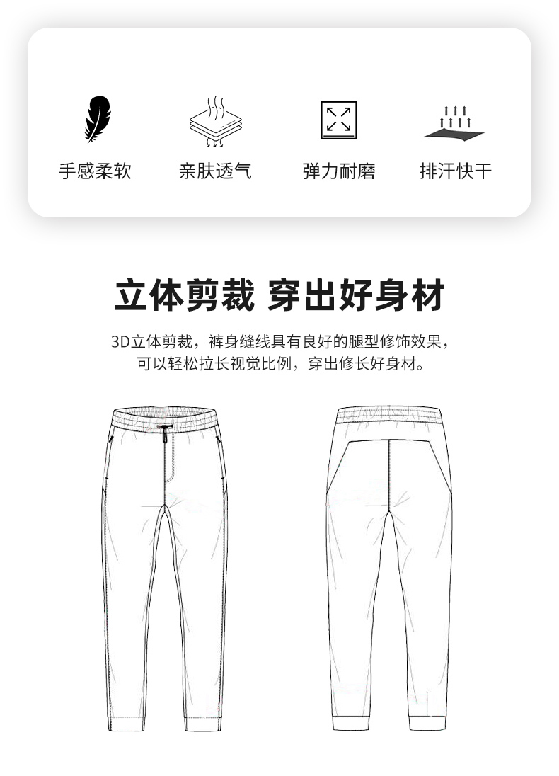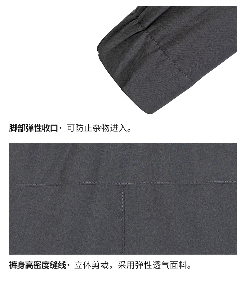 在款式上,3D立体剪裁,上身非常合体不影响运动时的灵活性和舒适性。两侧是隐形拉链口袋,弹力松紧+弹力抽绳的腰围,穿脱也方便。裤脚是弹力收口,可防止杂物进入。