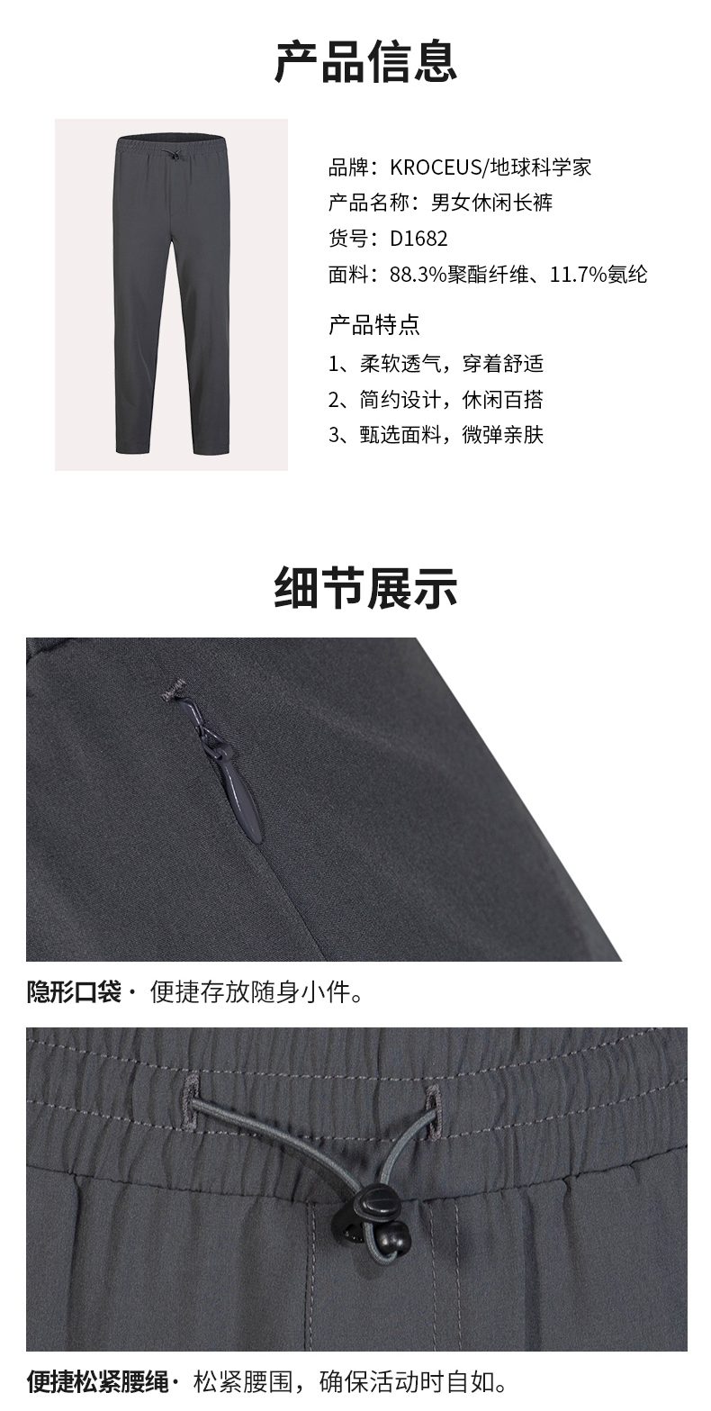 这款地球科学家速干裤,2021年新款,是男女都可穿的中性款,使用88.3%聚酯纤维+11.7%弹力氨纶混纺,摸起来的手感柔软,速干透气,还抗撕裂耐磨。具有速干透气效果,上身不闷不潮,出汗时不沾身。