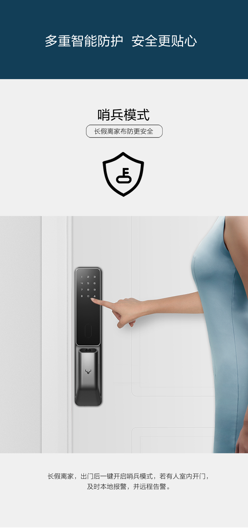升级半导体指纹模组,优化识别算法,达到98.96%的指纹识别率。配有“哨兵模式”,长假离家时一键开启,若是有人开门,立刻本地报警,并且手机APP收到弹窗警告。