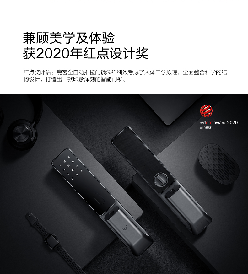 这款鹿客S30全自动指纹锁,是目前旗下的旗舰新款,于今年7月才刚上市,是一款高端的全自动指纹电子锁。荣获2020年德国红点设计奖,红点奖为世界级三大设计奖之一,也称为“设计界的奥斯卡”。