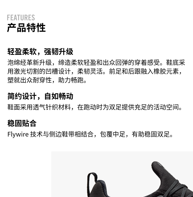 鞋面多块设计,用三针五线工艺拼接固定,脚背部分加厚设计,柔软舒适,带来良好的包裹感,侧边透气的针织面料,让双脚不束缚,后跟部位,上部分加厚,下部分贴合透气,上脚舒适,Flywire技术与侧边鞋带相结合,稳固双足,充分包覆。