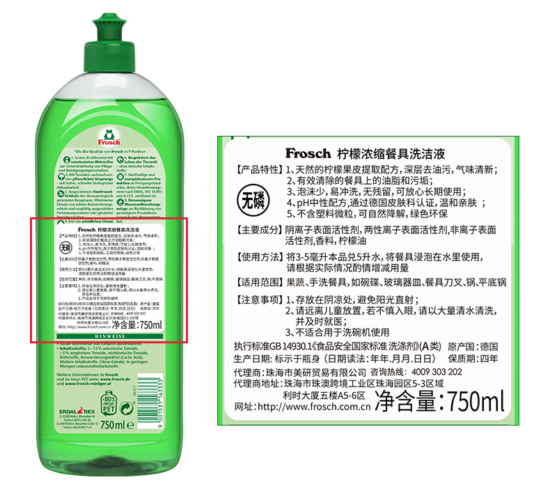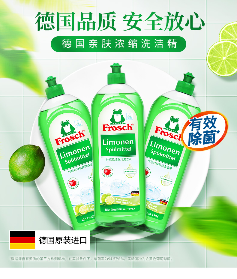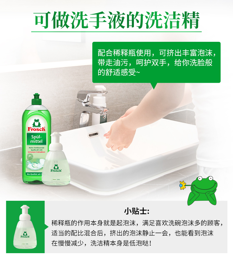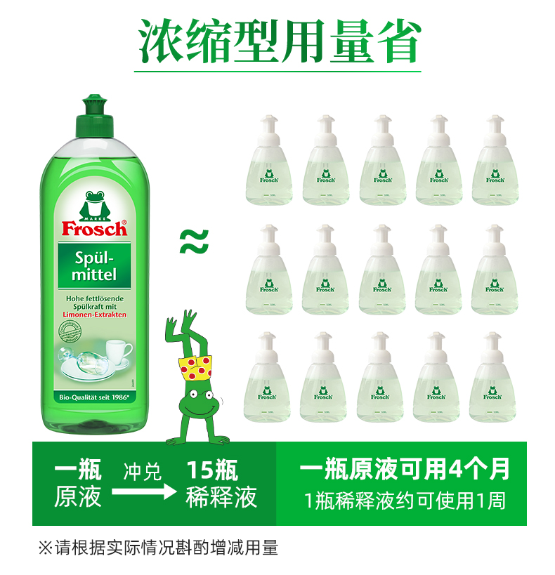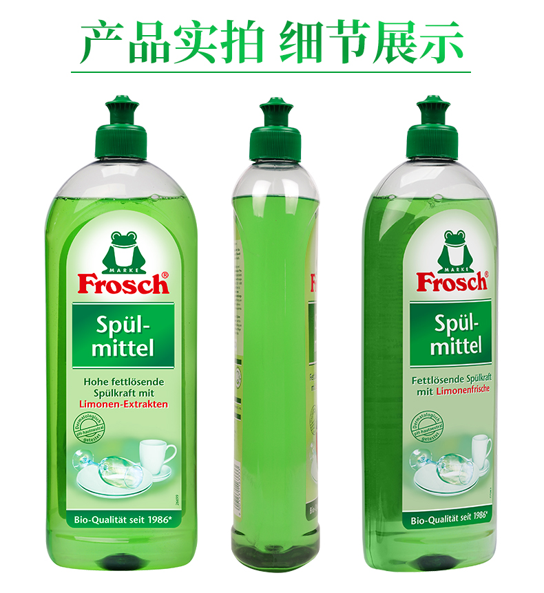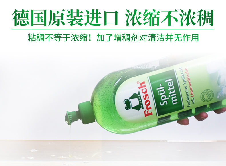 这款Frosch 柠檬浓缩洗洁精,萃取天然柠檬果皮精华,可迅速瓦解油污去异味、低泡浓缩强水溶性,轻松过水,碗具更洁净,产品高浓缩技术,不添加增稠剂,3-5ml可兑5L水,高效清洁的同时,保养洗济对象;瓶身可自然降解,环境零负担;使用之后,手感温润,拒绝干燥、紧绷甚至过敏反应。