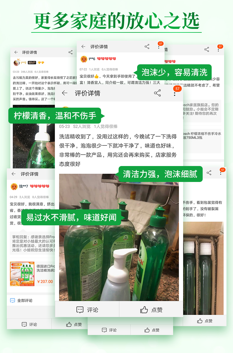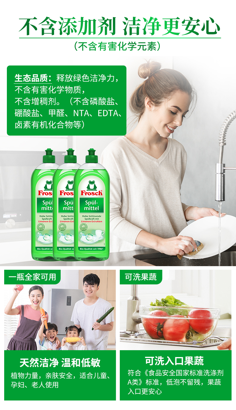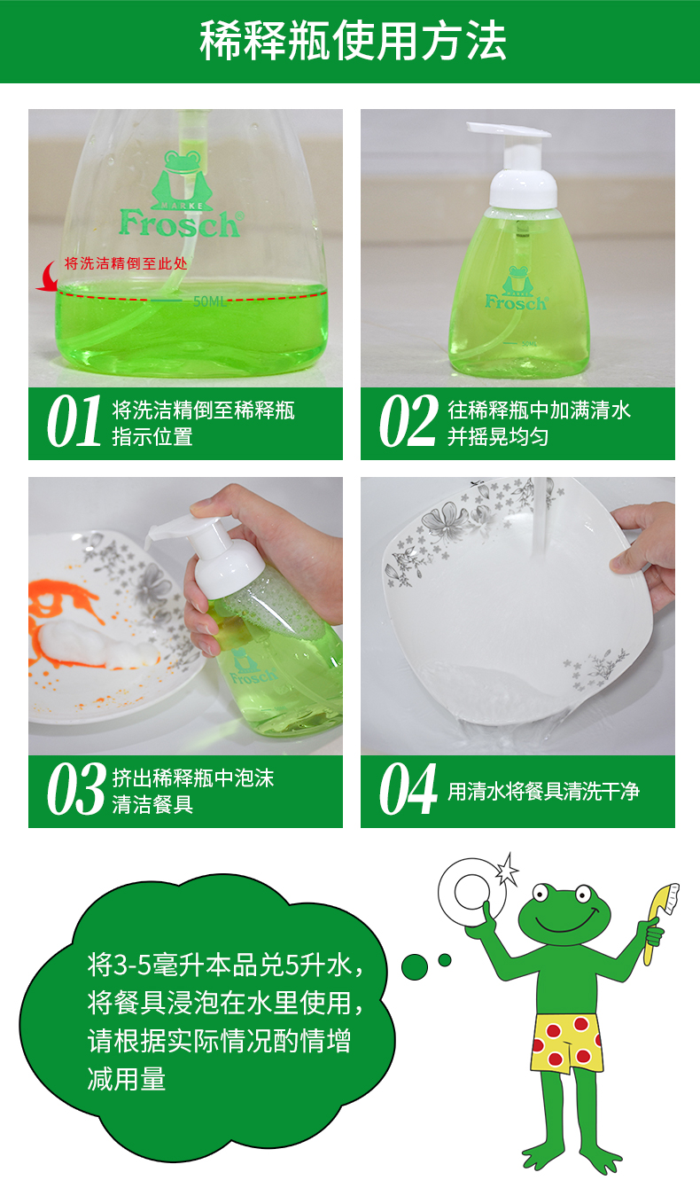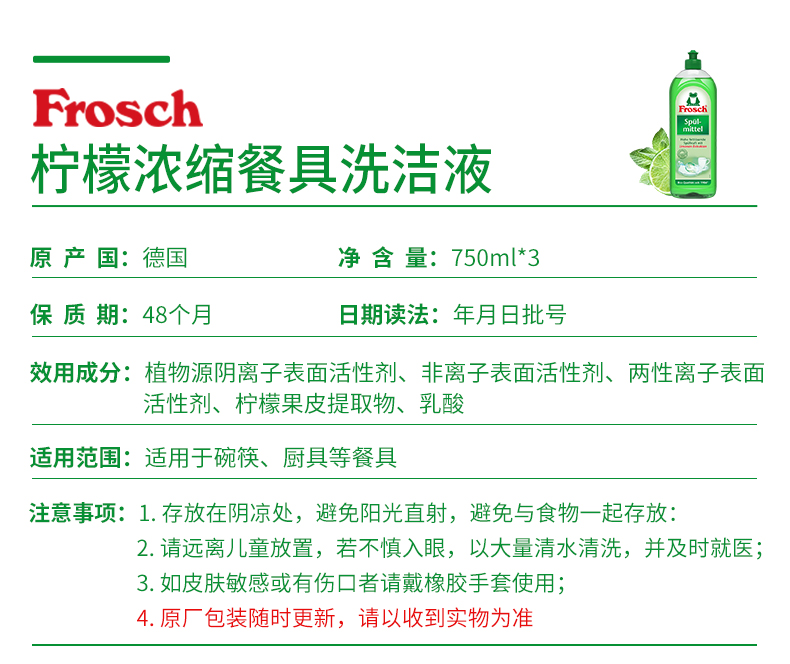 这款Frosch 柠檬浓缩洗洁精,萃取天然柠檬果皮精华,可迅速瓦解油污去异味、低泡浓缩强水溶性,轻松过水,碗具更洁净,产品高浓缩技术,不添加增稠剂,3-5ml可兑5L水,高效清洁的同时,保养洗济对象;瓶身可自然降解,环境零负担;使用之后,手感温润,拒绝干燥、紧绷甚至过敏反应。