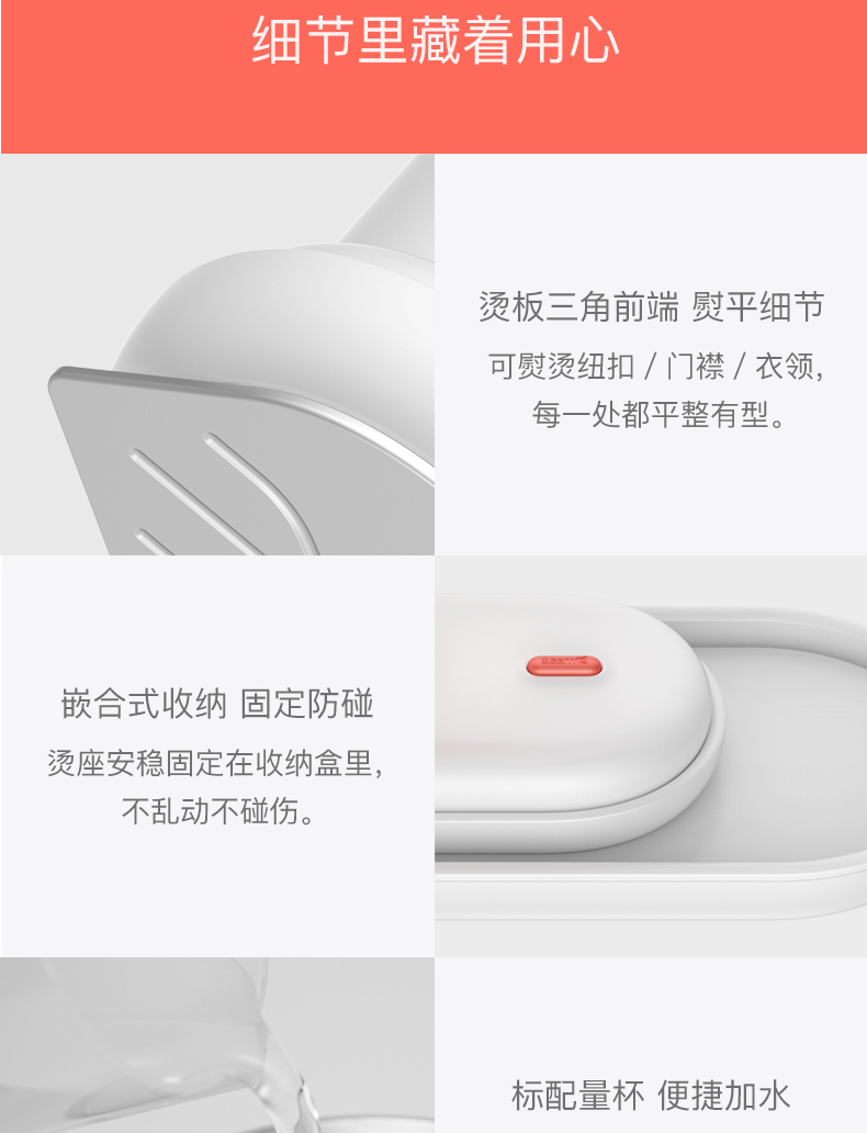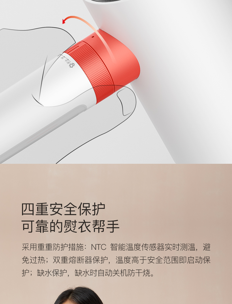 细节上:水箱容量110mL,作为挂烫机使用时,重量为740g,女生也可单手轻松操作。内置NTC智能温度传感器实时测温,避免过热;双重熔断器保护,温度高于安全范围即启动保护;缺水保护,缺水时自动关机防干烧。