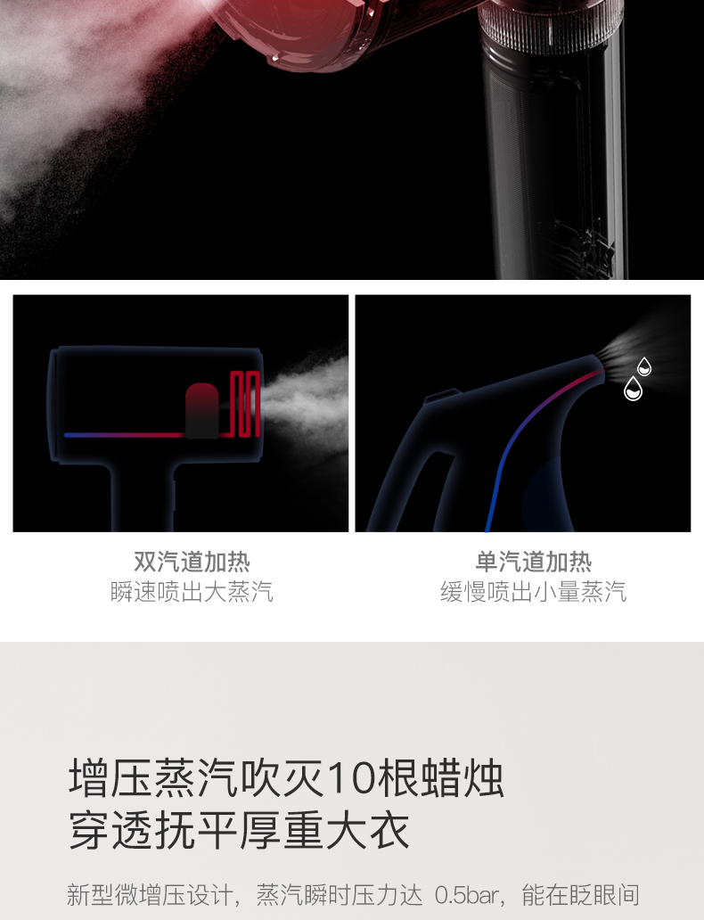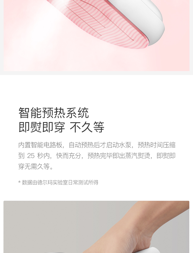 1000W额定功率,具有即热系统10秒可出蒸汽,蒸汽温度160±10摄氏度,采用新型微增压设计,蒸汽瞬时压力达0.5bar,里外穿透厚重衣物,提升熨烫效果。优化加热锅炉结构,将单汽道升级成双汽道,同步加热汽化,在至短时间内送出源源高温蒸汽来熨烫,快速省时,上班、会议、约会不迟到。