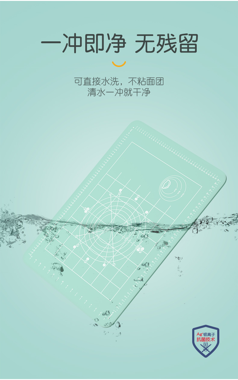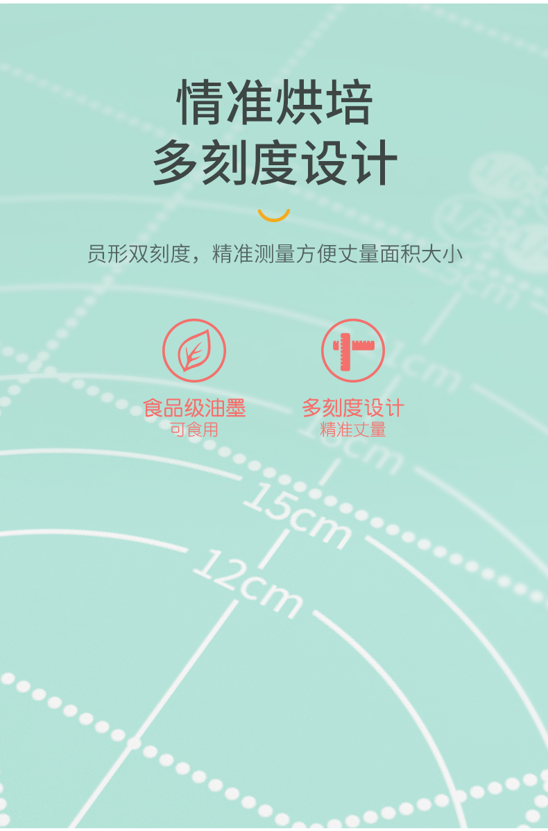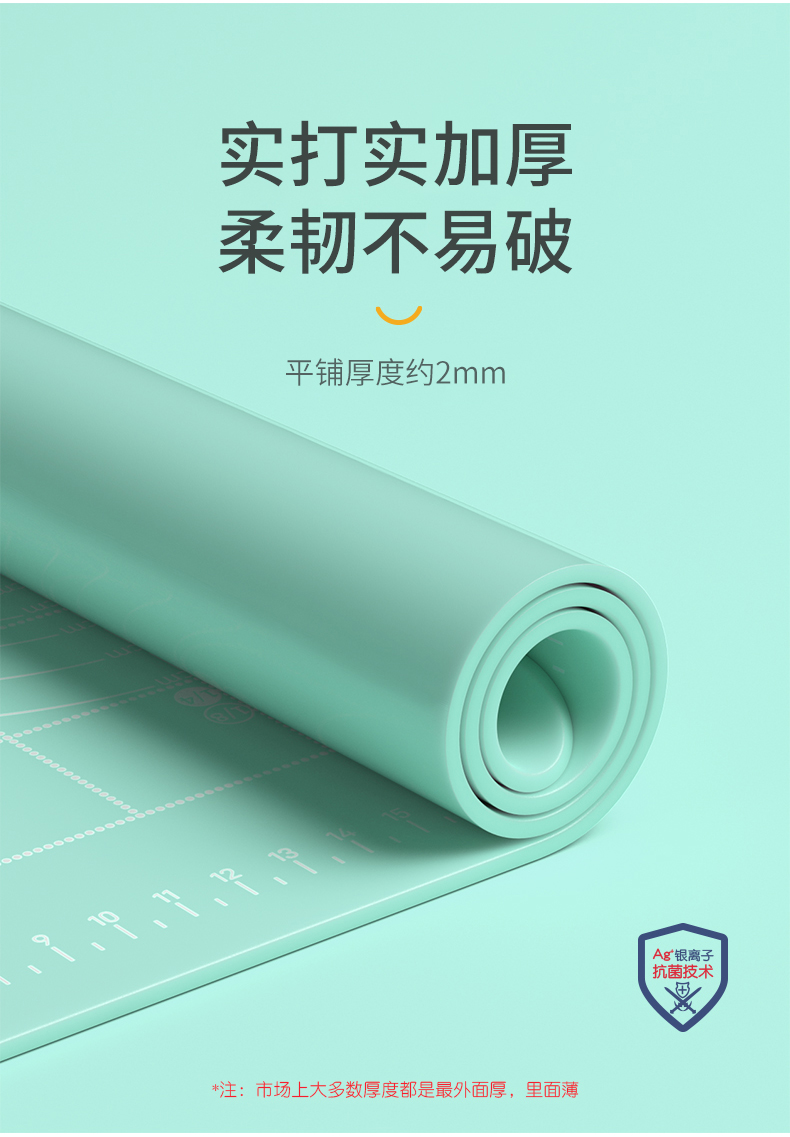 食品级 揉面硅胶垫,特殊防粘技术,面团不粘,易成型,银离子抗菌工艺,有效抑制细菌,背面防滑吸附桌面稳定,坚韧耐用不易翘边。揉面垫带有雕刻式刻度,相比油墨印染不掉色、不侵染食物,方便掌握用量,烘焙、包饺子,制作面点随心所欲,让你拥有更大的施展空间,喜欢制作面点的朋友不容错过。