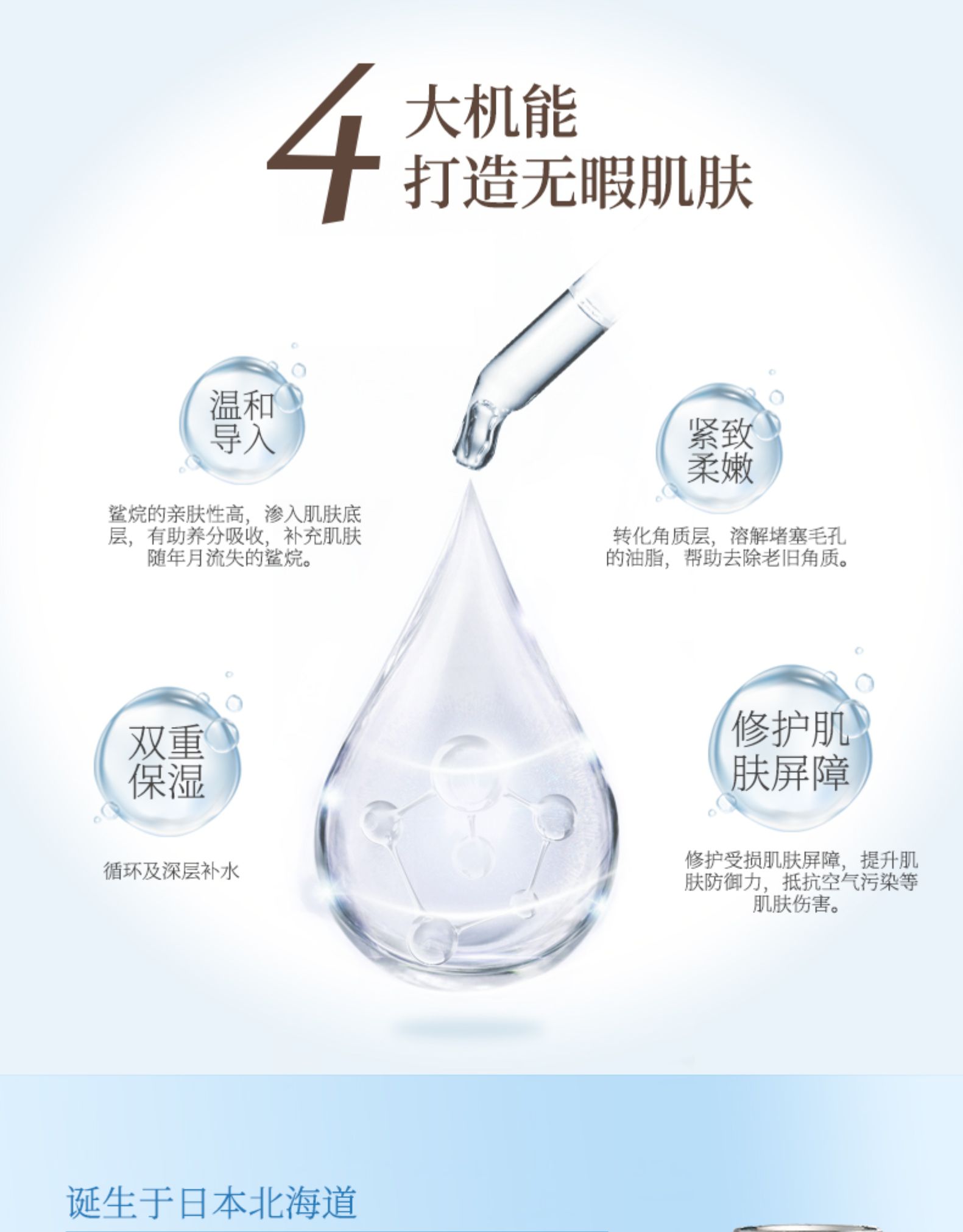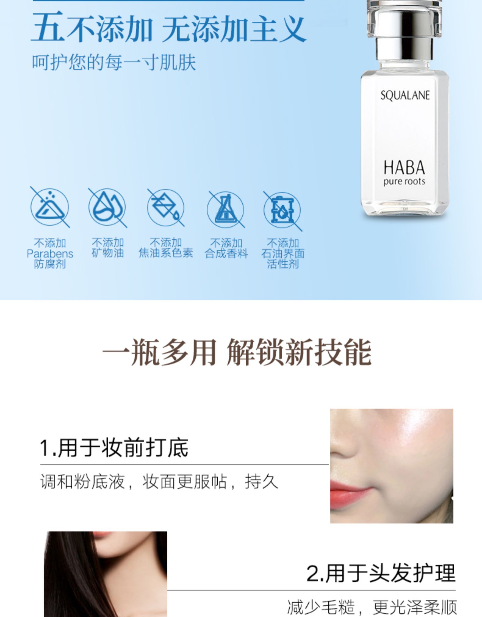 HABA这个来自日本奉行无添加主义的品牌,自创牌以来 ,一直坚持使用天然及优质的原料,不添加会刺激皮肤的化学成分,真正做到了让消费者安心使用,就如同品牌的本意Health Aid Beauty Aid(简称HABA)一样,给肌肤带来美丽的同时也关注肌肤健康。鲨烯是人体皮肤原本就具有的天然脂类成分,起着防止皮肤水分流失、保护皮肤免受外界损伤,使皮肤保持年轻美丽的作用,但是随着年龄的增长,人体自然分泌量会逐渐降低。SQ可以从外界补充不足的皮脂,重建皮肤的天然保湿保护屏障皮脂膜,并激活皮肤的新陈代谢、促进皮肤的呼吸作用,柔软皮肤,防止角质硬化 。