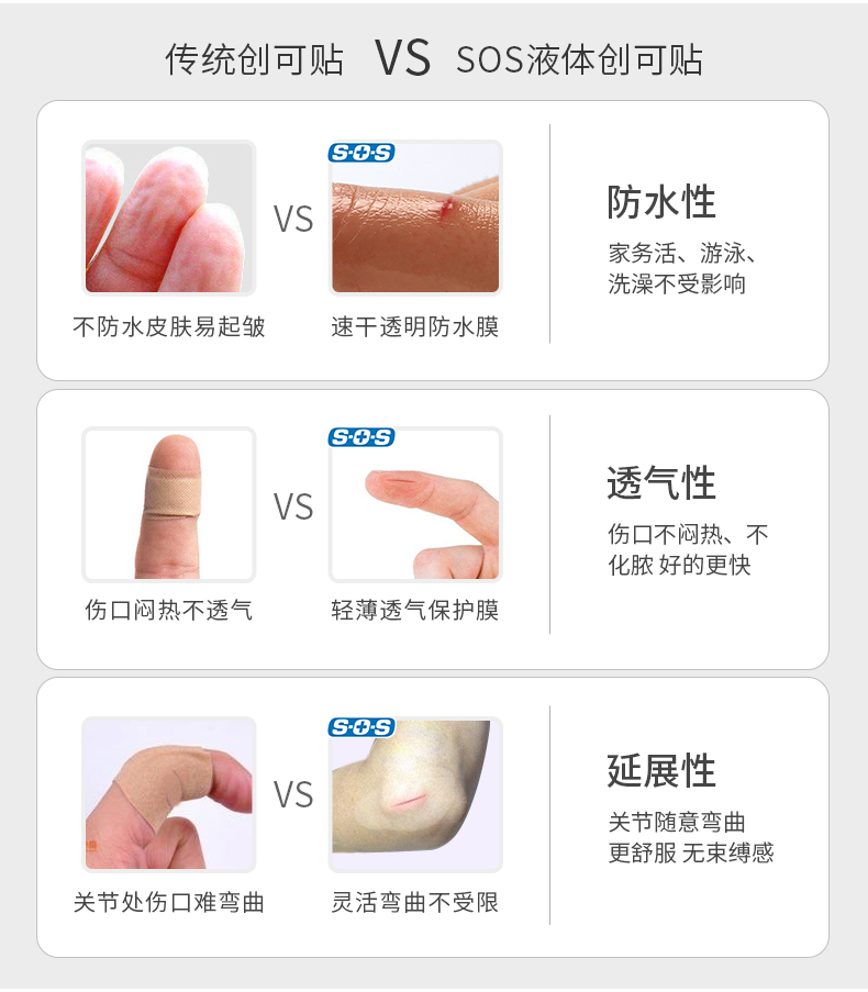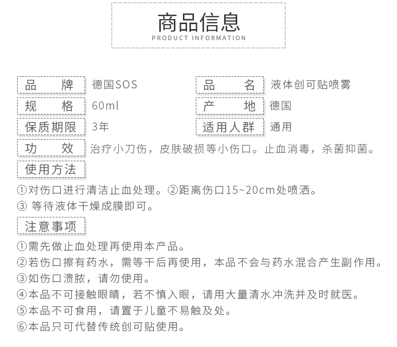 德国国民药妆品牌SOS,欧盟地区家庭长期信赖的护理类品牌,产品的覆盖率达到95%。SOS液体创口贴,液体喷雾胶(Pflaster-Spray),喷雾设计避免交叉感染,喷后伤口处快速形成防护膜。防水抗菌,物理消炎,不易脱落,延展性好,可以长久保护。产品主要成分:乙醚,丙烯酸酯共聚物,二甲醚等,适用所有人群的一般性表皮破损出血等外伤。