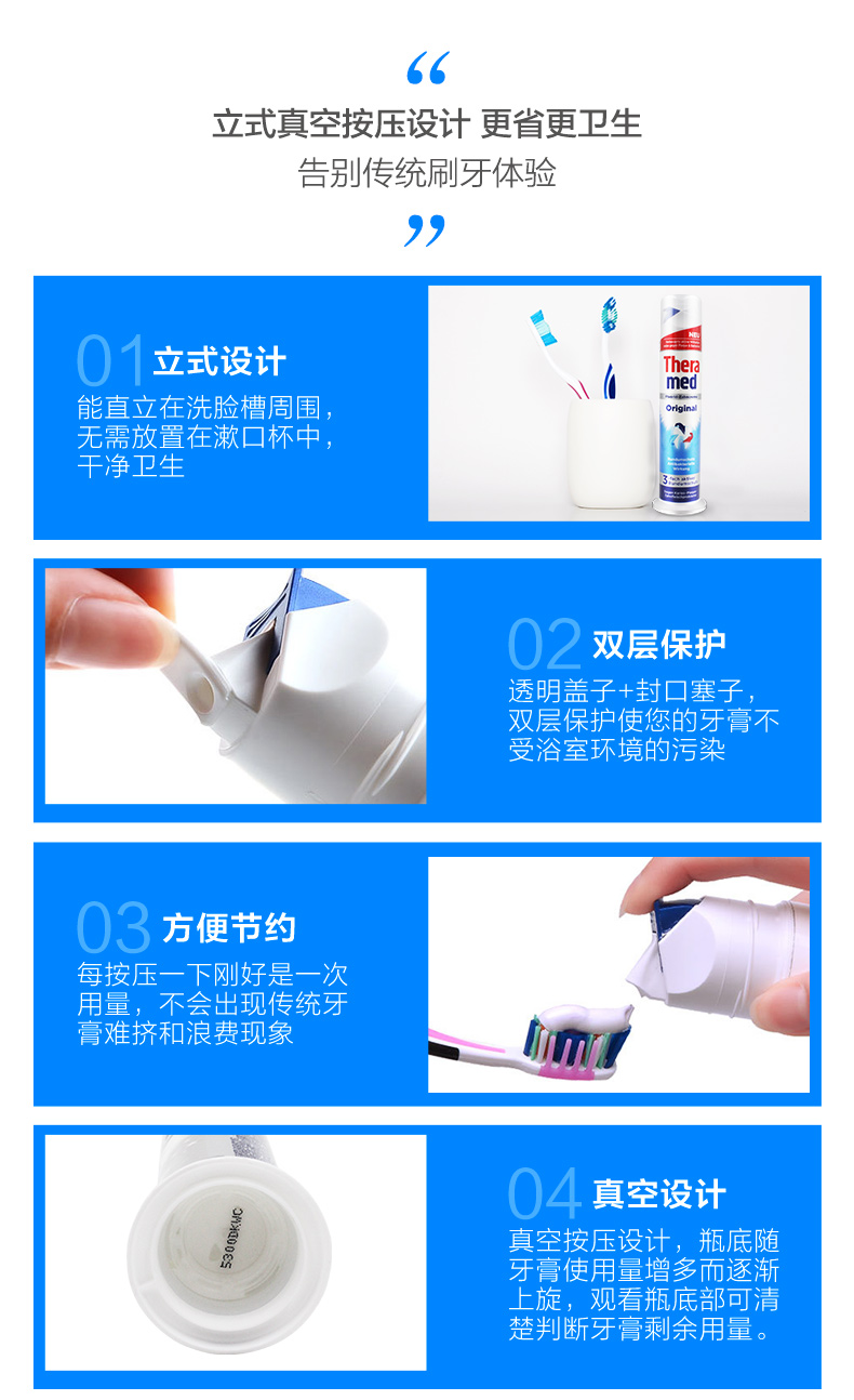 这款牙膏小编入手了,最大的感觉就是泡沫少,以前用的牙膏总要漱口好几次才干净,这一款只需要3次。直立式放置,省空间,摆着也好看。按压式设计,按一次就是一次的用量。小编之前买的是土耳其产和德国产随机发货,不幸收到的是土耳其版,这次全部是德国版,放心买吧!