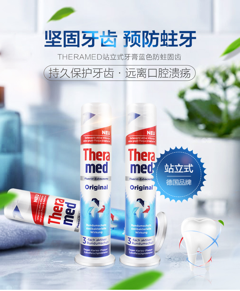 具有自然美白、防蛀固齿的功效,能在无漂白剂和无清洗颗粒的前提下柔和地清除牙齿上的杂色和污垢,使牙齿恢复自然美白,内含的活性氟组合成分能持久地保护牙齿,深受欧洲人喜爱。另外该款按压式的设计确保牙膏不残留,低泡膏体,开盖12个月用完即可。