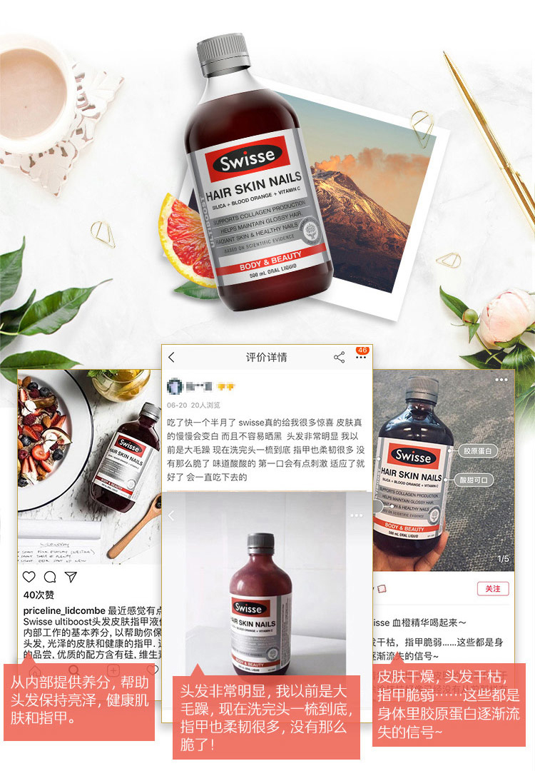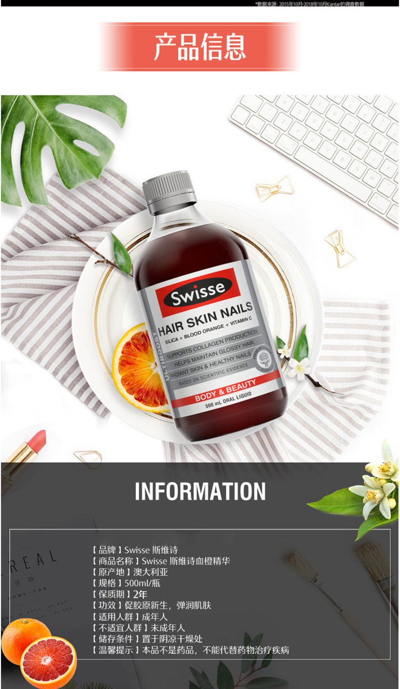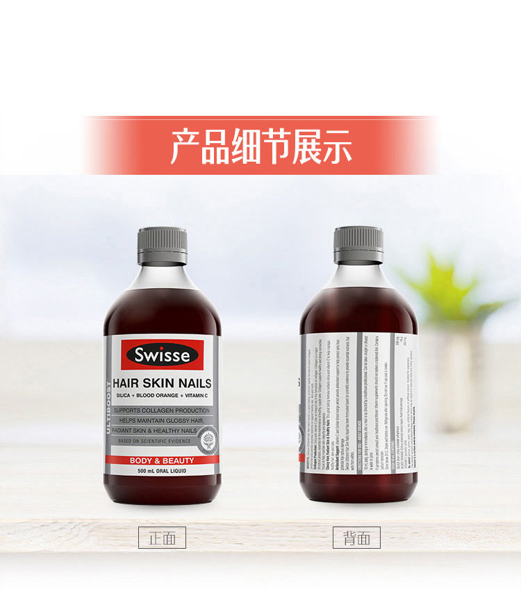 500ml大瓶装,每日服用10-15ml。基于科学研究,采用口感上佳的优质配方,含天然血橙提取精华,二氧化硅、维生素C。促进胶原蛋白的生成,保障健康的头发、肌肤、和指甲,提供必要的营养。具有提高细胞活性,光鲜亮丽肌肤、秀发和坚固指甲的作用。