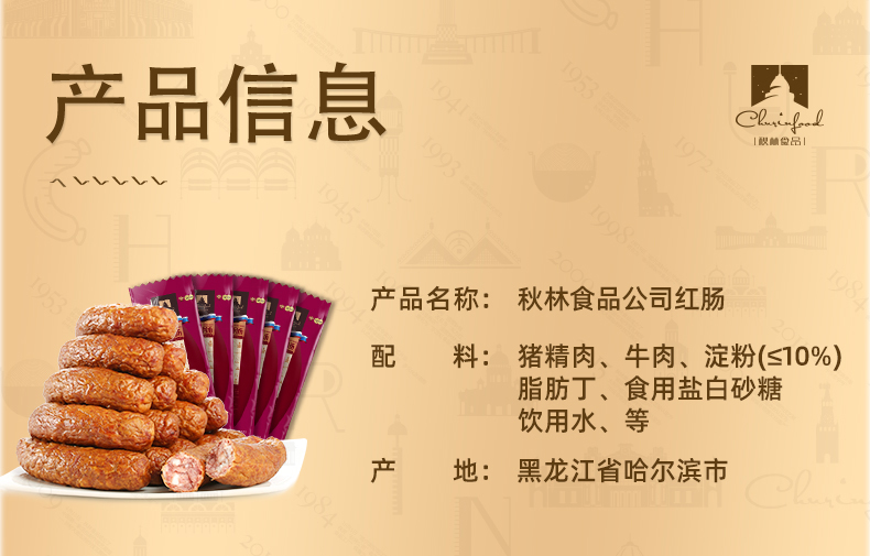 哈尔滨红肠已经有近百年的历史,哈尔滨特产的标志。品牌有好多种,都各具特色,而其中最受欢迎的就要数这款“秋林里道斯红肠”。秋林·里道斯 在欧式灌肠的基础上,结合我国人民口味,加大精瘦肉的比例,减少肥肉比例,具有蛋白质含量高、低脂肪的特点,口感和品质受广大消费者欢迎。