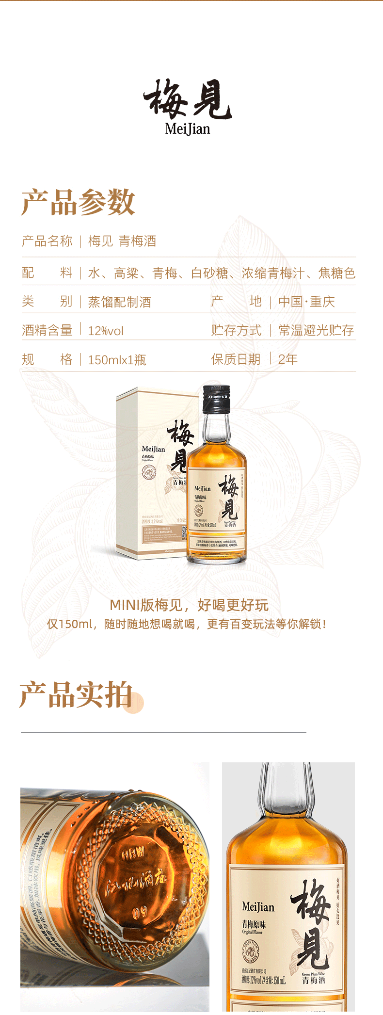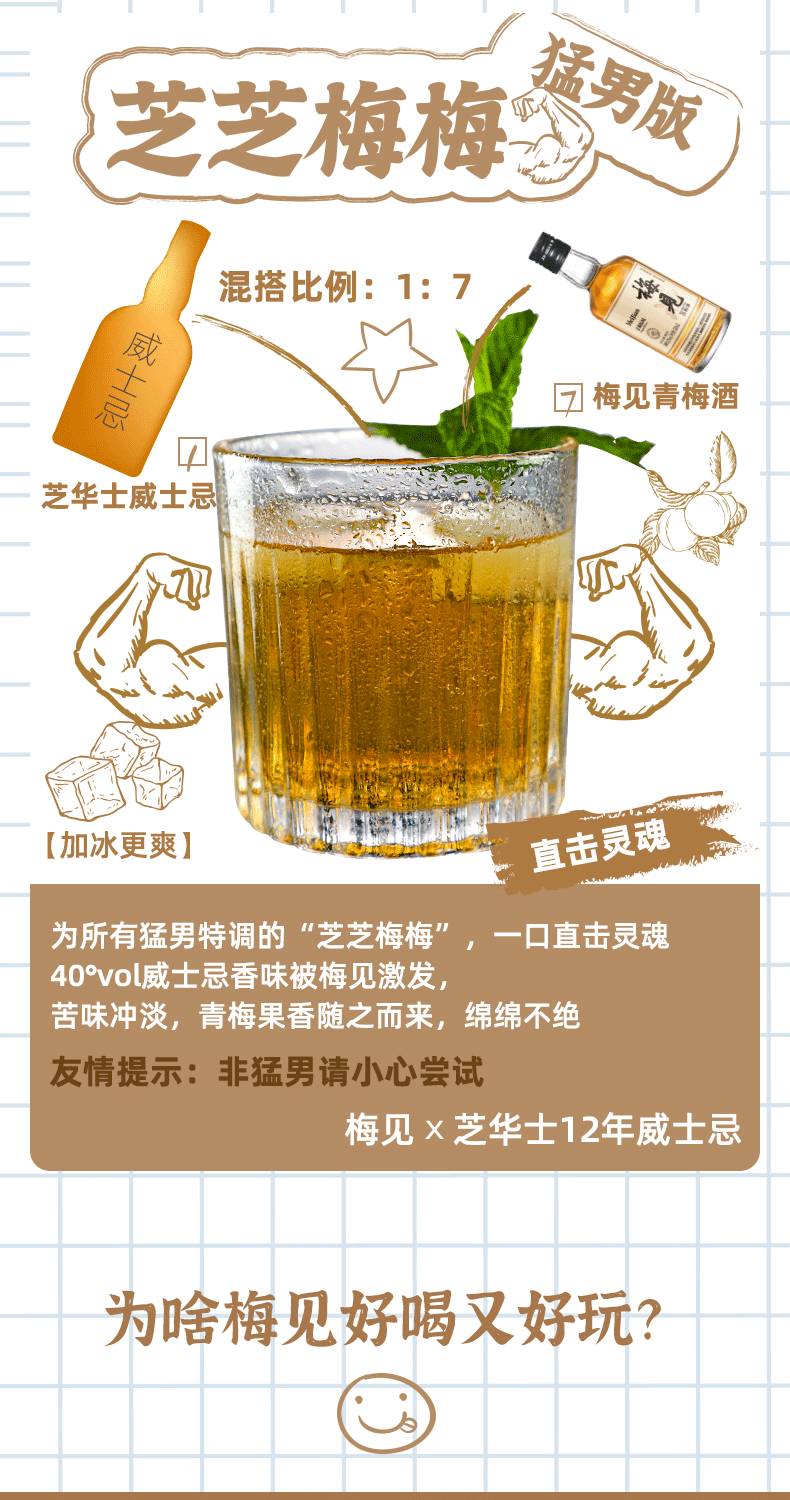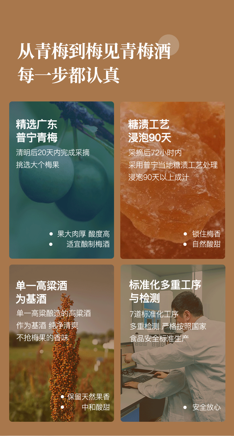 酿制方面:采用国家地理标志认证的普宁青梅,精选过大肉厚青梅,遵循传统工艺,采摘后72小时内糖渍工艺处理,历经90天缓慢出汁,保留纯粹青梅滋味。选用单一高粱酿造的高粱酒作为基酒跟其他白酒比起来口感更纯净,杂味更少,能更好的跟青梅融合,达到酸甜平衡没有杂味。