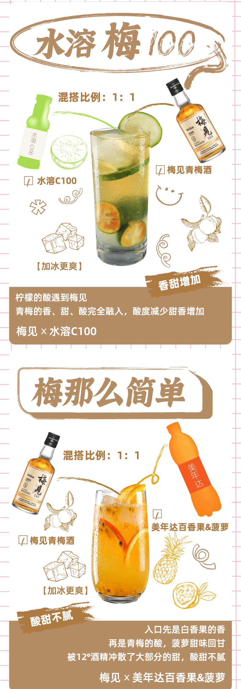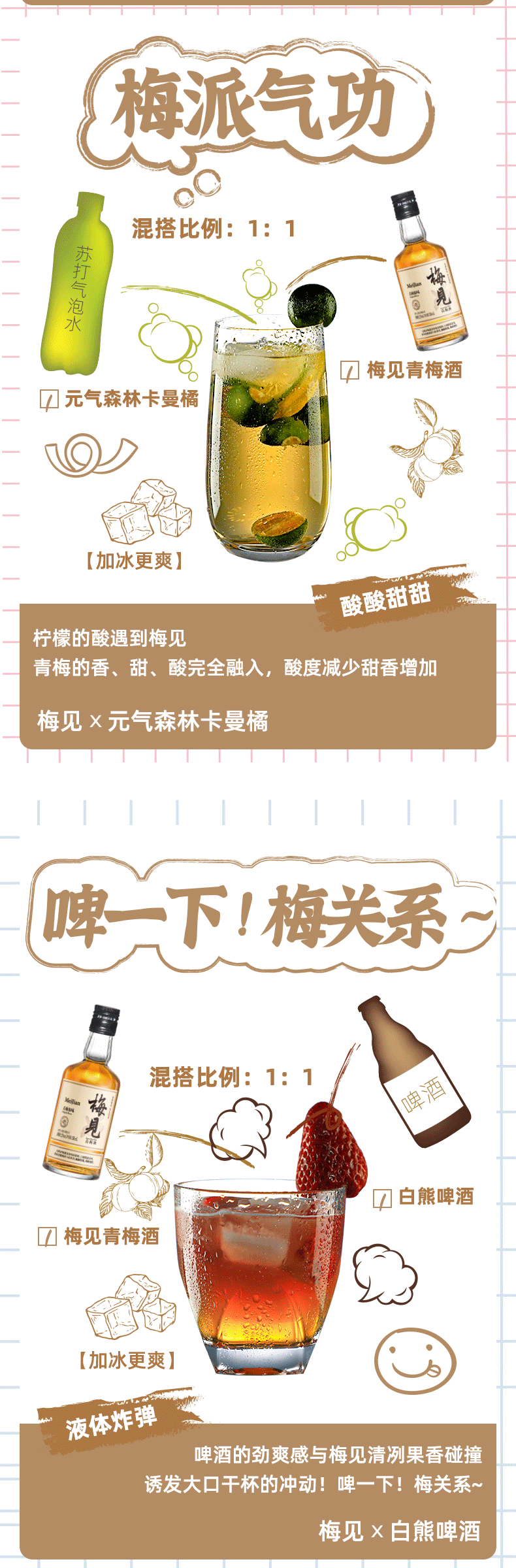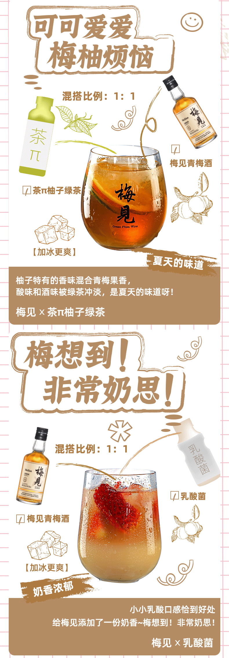 酿制方面:采用国家地理标志认证的普宁青梅,精选过大肉厚青梅,遵循传统工艺,采摘后72小时内糖渍工艺处理,历经90天缓慢出汁,保留纯粹青梅滋味。选用单一高粱酿造的高粱酒作为基酒跟其他白酒比起来口感更纯净,杂味更少,能更好的跟青梅融合,达到酸甜平衡没有杂味。