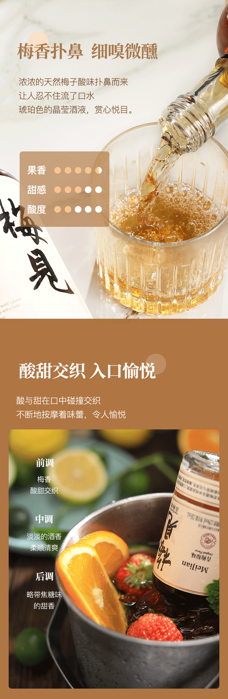 酒体呈现晶莹琥珀色,梅香扑鼻酸甜交织,略带焦糖的甜香。刺激味蕾,令人愉悦,12度微醺,常温饮用与冰镇皆宜,清爽的青梅酒更适合中国人口感,搭配中西餐都很配。