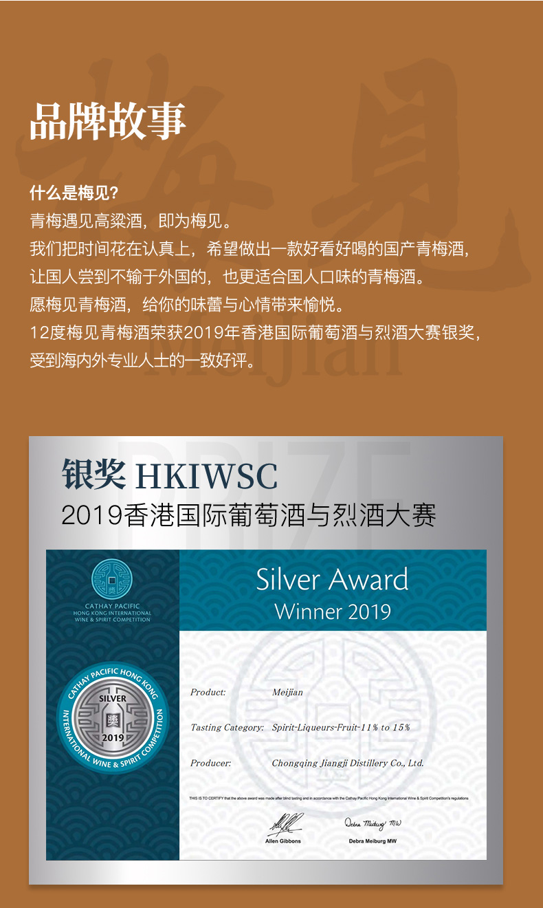 梅见荣获了2019年香港葡萄酒与烈酒大赛银奖,是中国首款获此项大奖的青梅酒,受到海内外专业人士的一致好评。