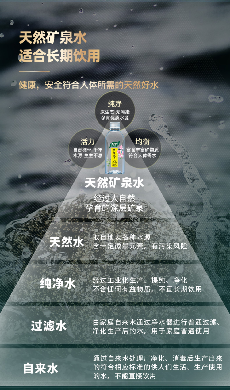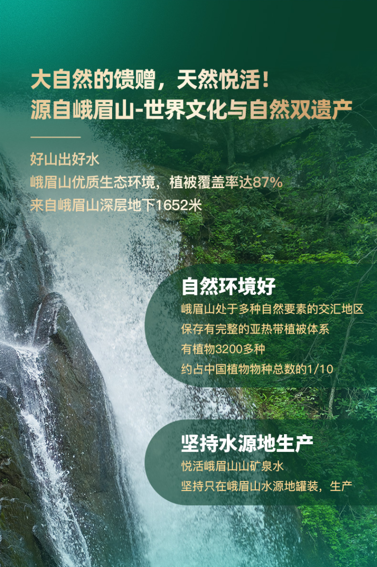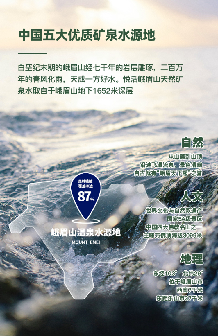 中粮集团旗下健康饮品品牌,峨眉山是世界文化与自然双遗产,中国优质天然矿泉水源地之一。口感柔软,清洌甘甜,含天然锶、偏硅酸等多种人体所需矿物质元素,矿物质含量适量,适合长期饮用。