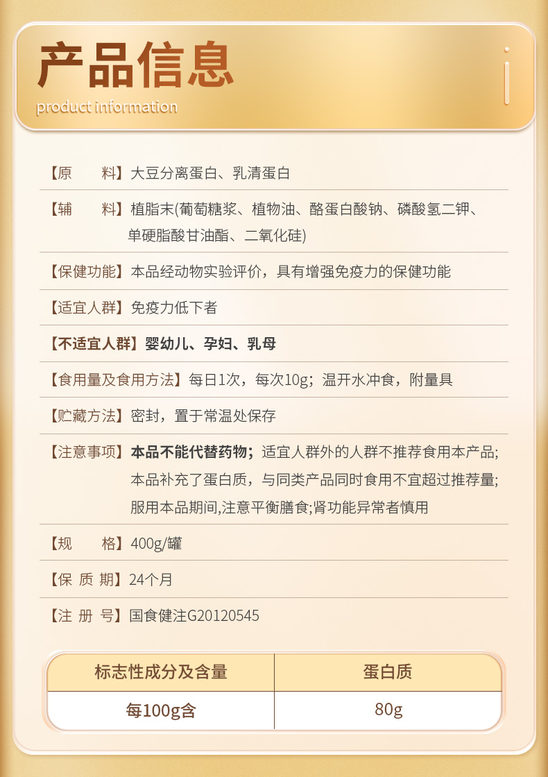 这款蛋白粉,蛋白质含量高达80%,双蛋白配方,动植物双蛋白 进口乳清蛋白。精选非转基因大豆分离蛋白+新西兰进口乳清蛋白,双蛋白配方,协同互补,同时补充人体所需9种氨基酸,增强免疫力。