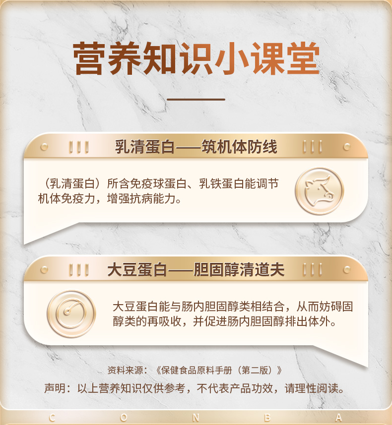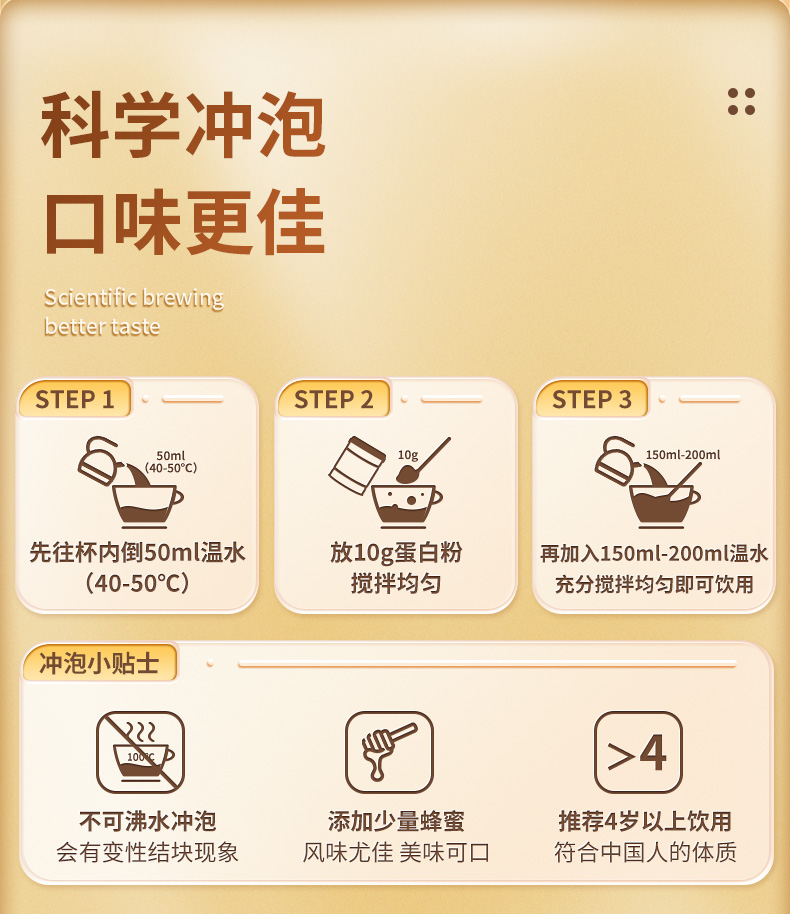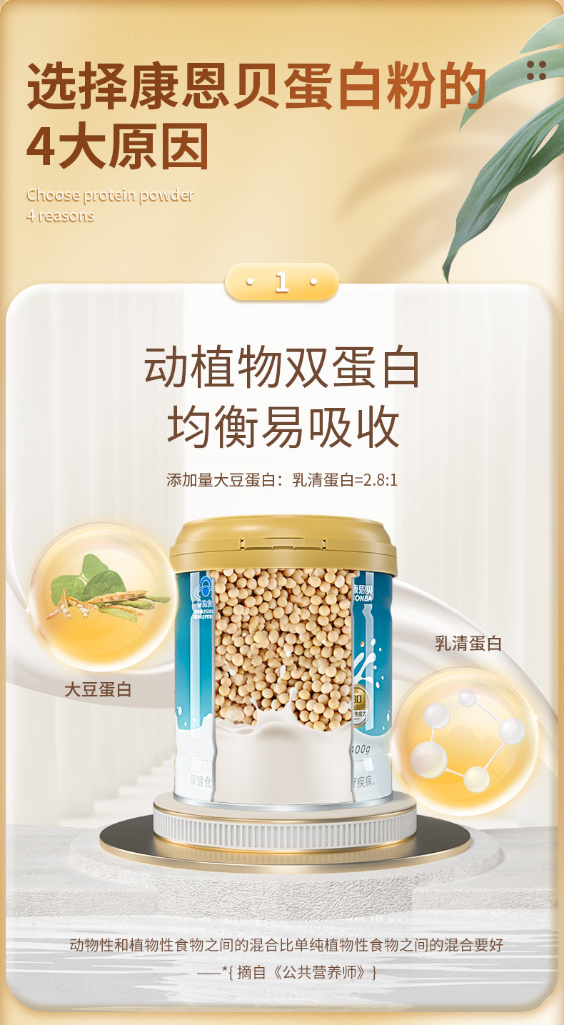 双蛋白配方提高蛋白质的利用率。更容易被人体吸收利用,同时补充人体所需9种氨基酸,增强免疫力。蛋白质消化率校正氨基酸计分(PDCAAS)为1,更容易被人体吸收利用。不添加激素、色素、人工香精和蔗糖,是健康纯净的蛋白质粉,符合现代健康理念。