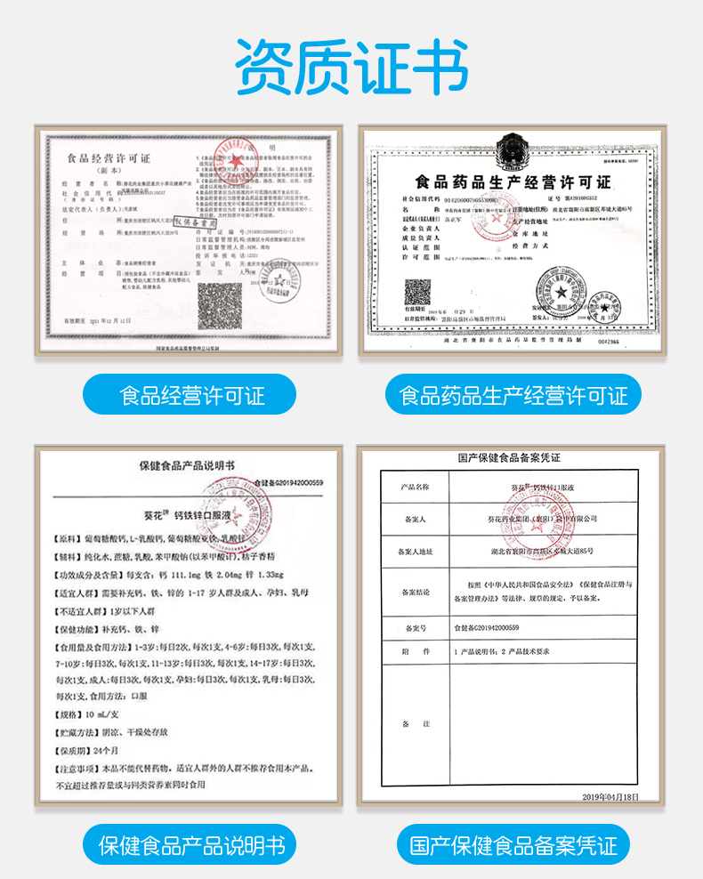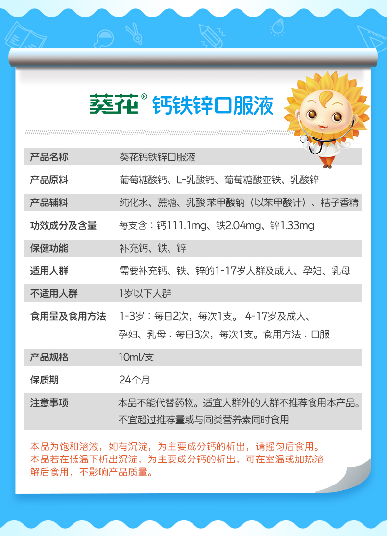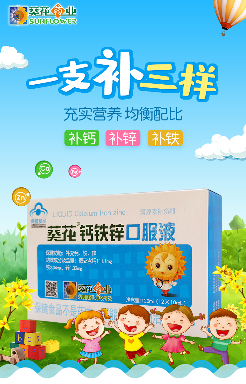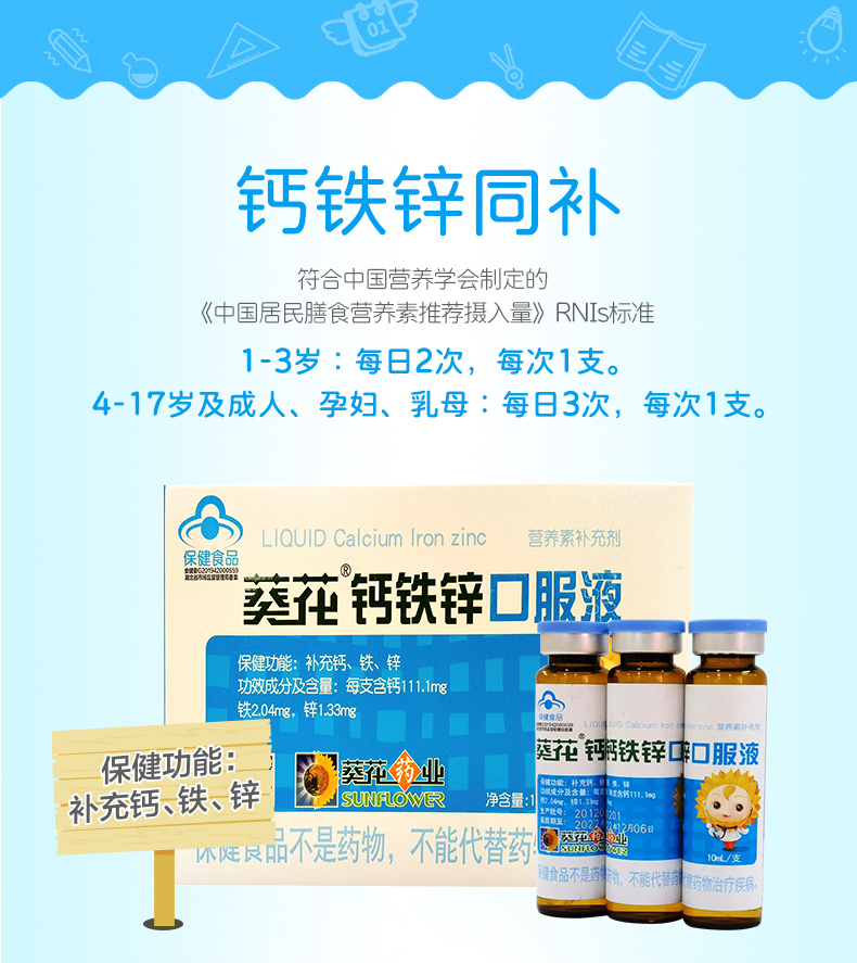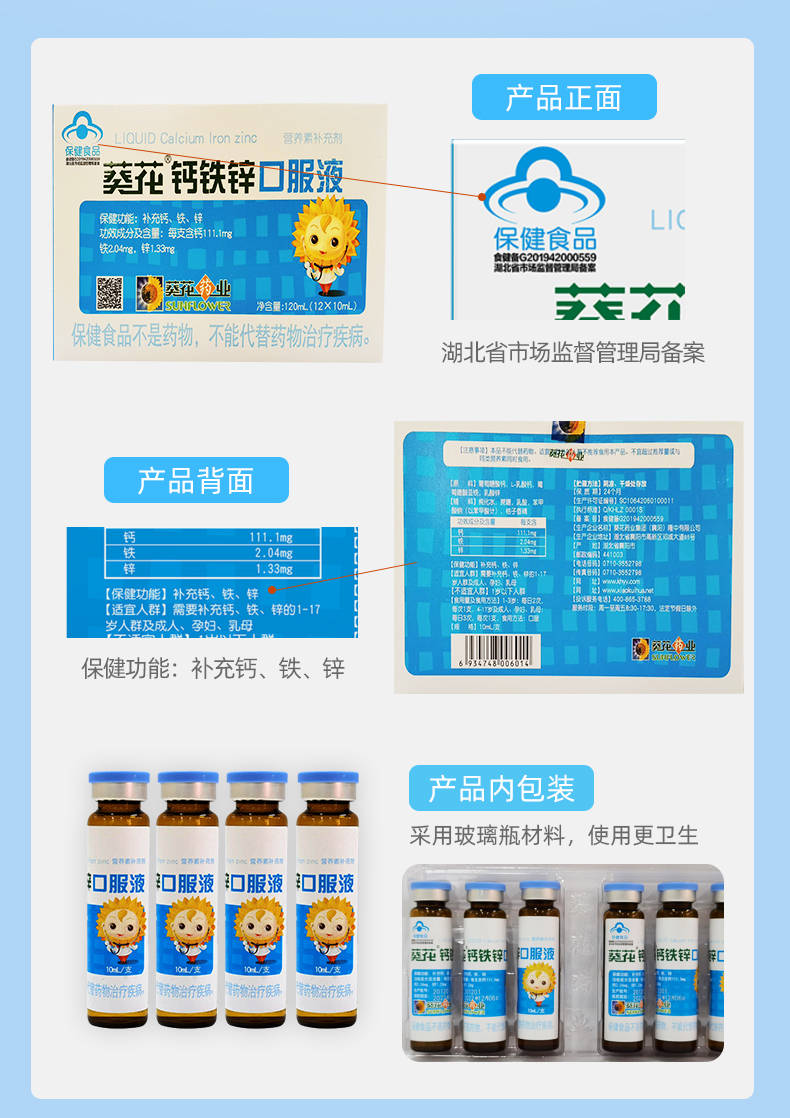 葵花品牌,线下药店都有卖,钙铁锌口服液儿童成长补钙,宝宝葡萄糖酸钙锌口溶液,一支补钙铁锌三样,每支含钙111.1mg、铁2.04mg、锌1.33mg液体钙易吸收。液体钙溶解度好,钙离子更易被吸收。适合儿童、孕妇、乳母等补充营养。旗舰店发货,品质靠谱。