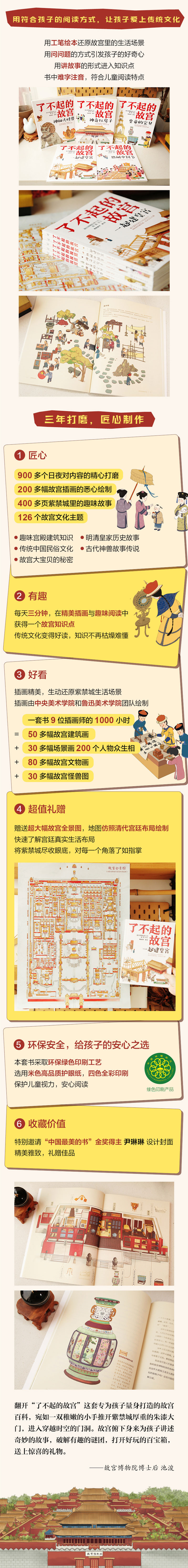 这款《了不起的故宫》 全套5册,专为6~14岁孩子量身打造,由故宫博物院博士后-池浚审订推荐,拥有趣味宫殿建筑知识、明清皇家历史故事、传统中国民俗文化、古代神兽故事传说和故宫宝贝的秘密,用孩子感兴趣的视角重新认识故宫,在趣味阅读中获得海量知识。