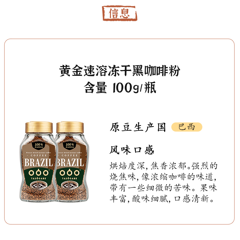 这款隅田川 黄金速溶冻干纯黑咖啡,是一款美式无蔗糖的浓黑苦咖啡,巴西原装进口,100%的阿拉比卡原生咖啡豆,普遍比罗布斯塔豆在口感上更优越,层次丰富而顺畅。