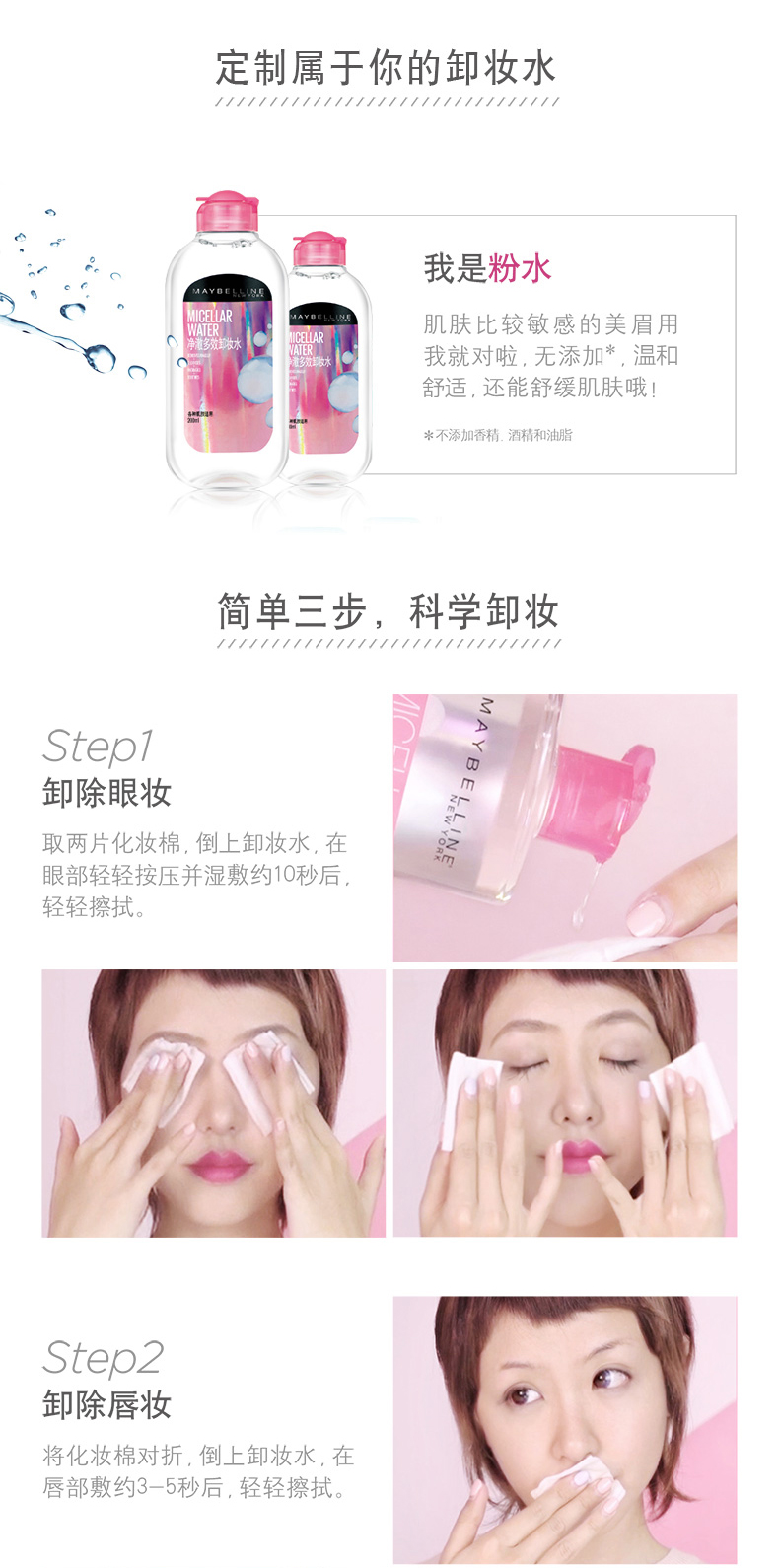 这款Maybelline 美宝莲 净澈多效卸妆水 ,光洁水润,一抹轻松卸,温和不紧绷,定制属于你的卸妆水,敏感肌也能轻松使用,简单方便,清洁力看得见。粉水,适合多种肤质脆弱肌肤亦可,成分温和,简单上脸舒缓保湿;绿水,适合混合肌肤以及油性肌肤,上脸干净清爽,向油腻说不。
