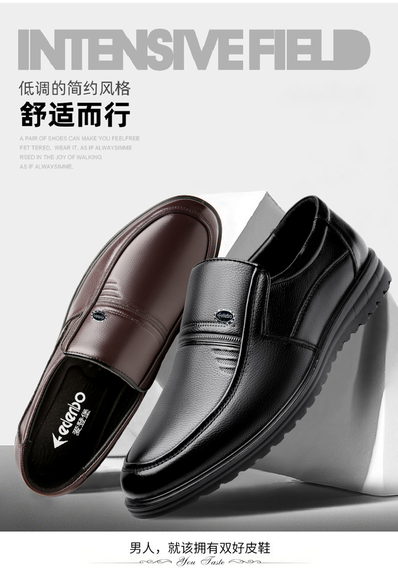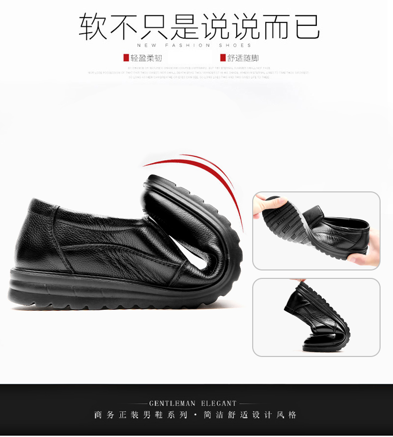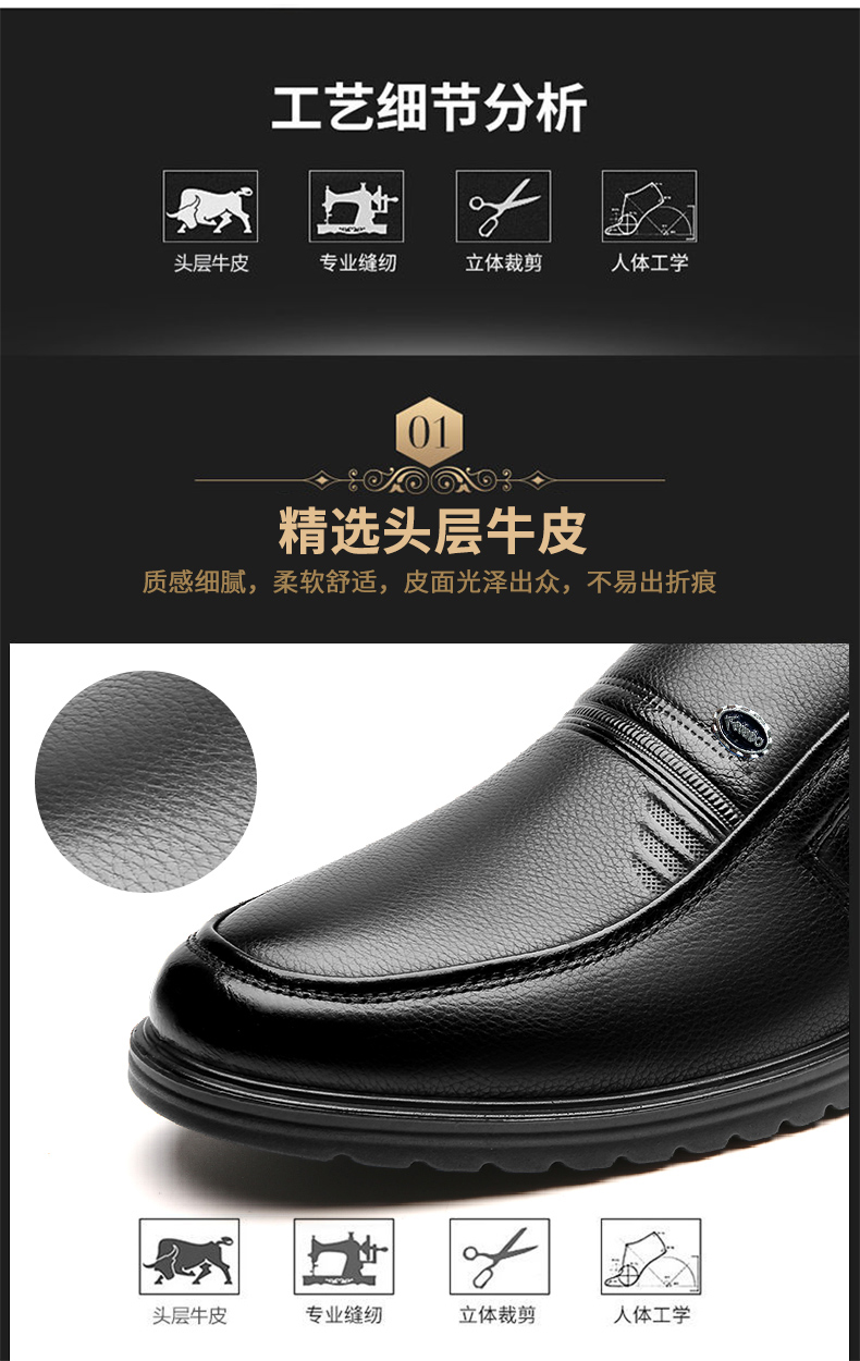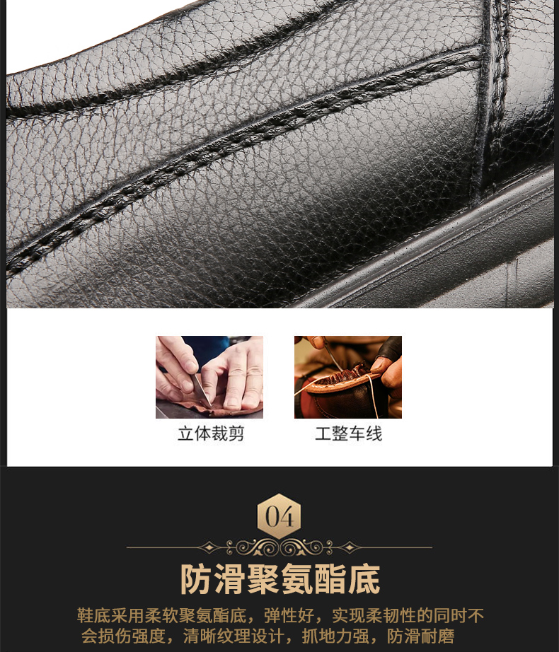 这款皮鞋,鞋面采用头层牛皮材质,质感细腻,皮面光泽出众,天然纹理,柔软有韧性,鞋底柔软聚氨酯,结实耐磨柔软有韧性,搭配防滑底纹,抓地力强,行走安全,脚感舒适,久穿不累,日常休闲走路、开车都能穿。