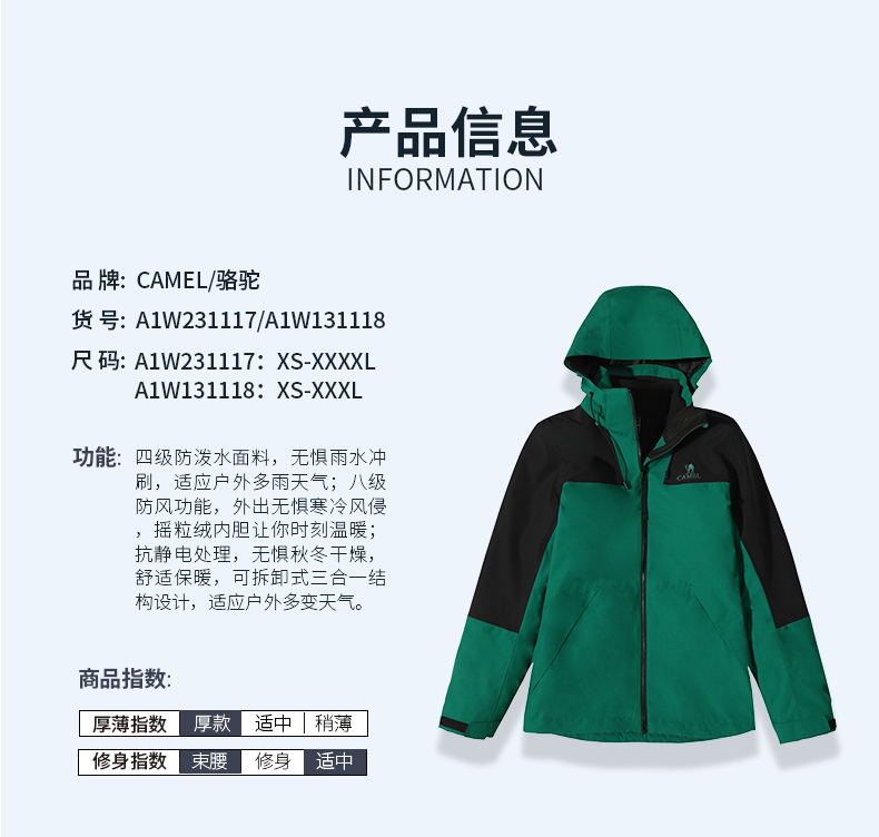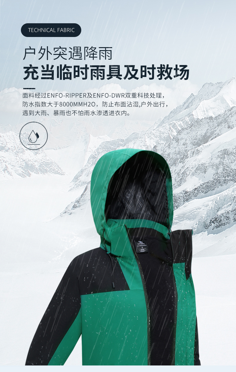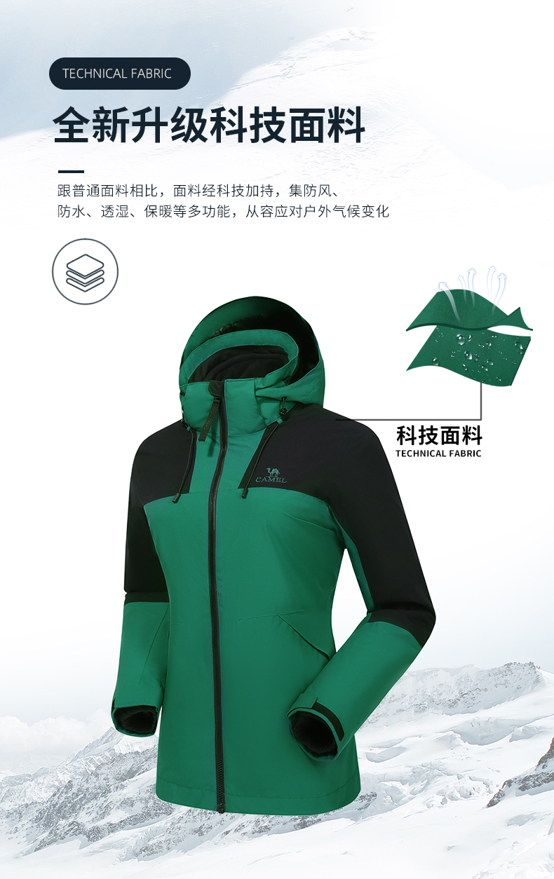 骆驼官方旗舰店669元669元,下单立减167.25元,可领102元优惠券,实付399.75元到手;这款 户外山系系列 三合一冲锋衣,,加持了防风、防水、透湿、保暖多种功能,适合户外徒步、登山等寒冷地带的旅行,面料经过ENFO-RIPPER及ENFO-DWR双重科技处理,防水指数大于8000MMH20,户外出行,遇到大雨也不怕雨水渗透进衣内。