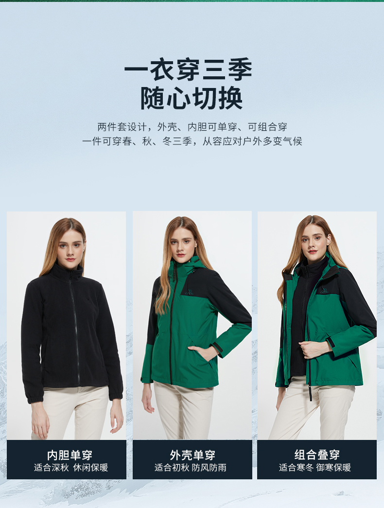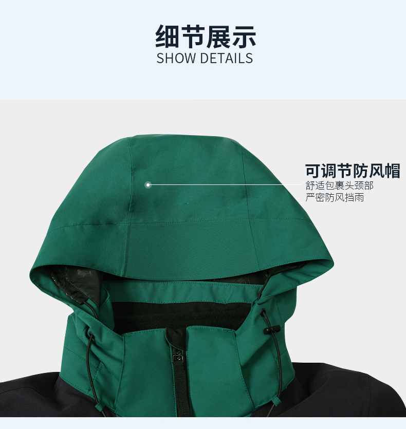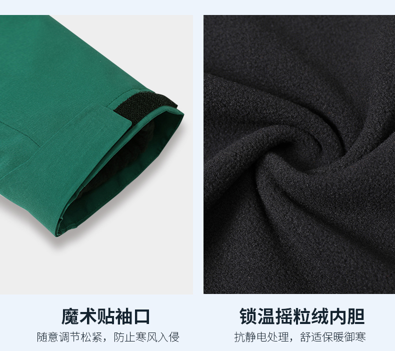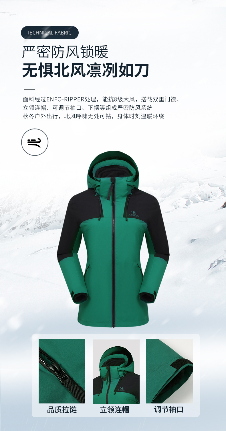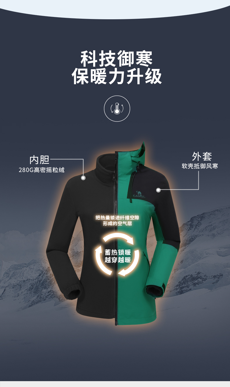 内搭280G摇粒绒内胆,双刷双摇,绒质蓬松,ENFO抗静电处理,可持续提供温暖,可与外层冲锋衣合穿,也可分别单穿,春、秋、冬季都能穿,搭配灵活适应场景广,日常都市、户外出游都适合。