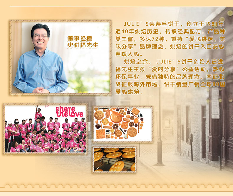 Julie's(茱蒂丝)成立于 1981年,隶属于柏发食品(马来西亚)有限公司旗下品牌,是大马人耳熟能详的饼干品牌,销往全球70多个国家和地区,是大马饼干业的龙头品牌。