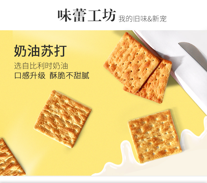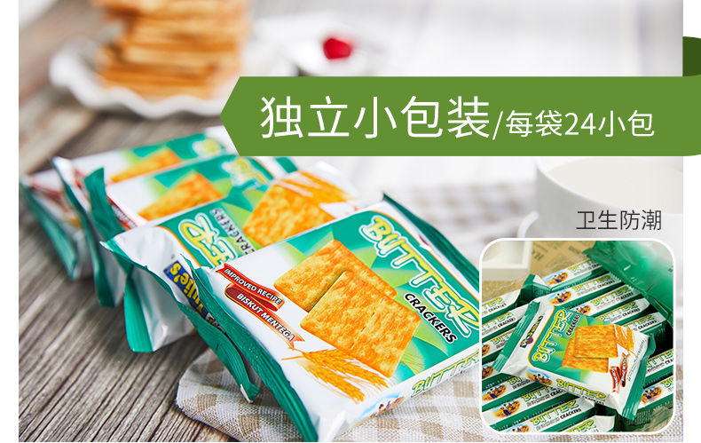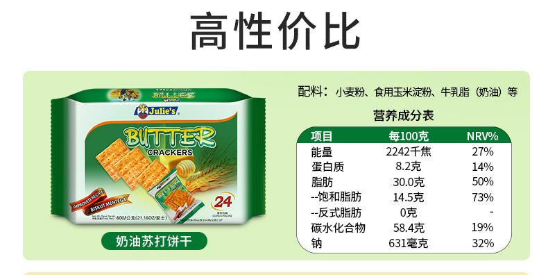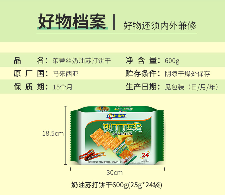 这款Julies 奶油苏打饼干,是马来西亚原装进口,精选原料经过12道压制工艺烘焙而成,色泽金黄,奶香浓郁,清咸不腻,香酥可口,0反式脂肪,食“尚”主义者首选,是作为零食,早餐,下午茶的极佳伴侣。小袋包装,携带方便。