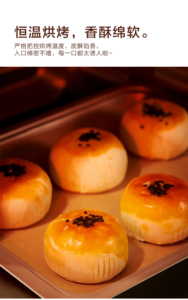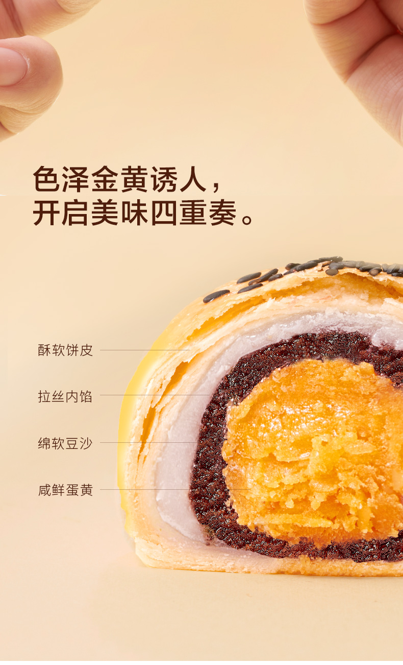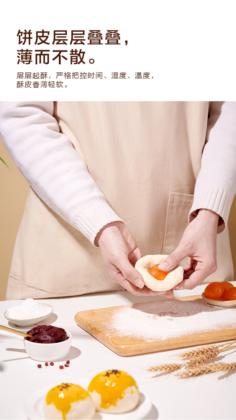 甄选小麦粉、蛋黄液、全脂乳粉、红豆沙、黑芝麻等优质食材为原料,三层馅料叠加,外皮层层起酥,严格把控时间、湿度、温度,多区控温烘烤,告别传统口感的干涩,多层起酥,丝丝润滑,回味香浓,甜而不腻!