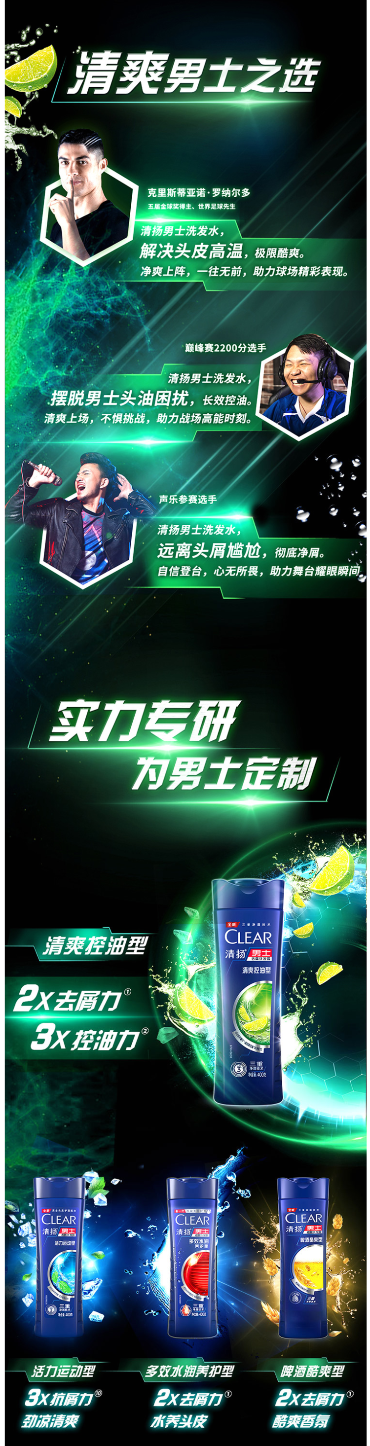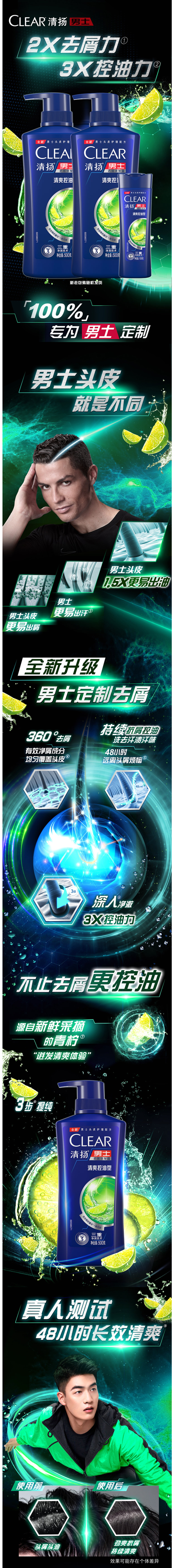 清扬活力薄荷运动洗发露,专为男士设计,含有双重去屑成分,强力去除头皮屑;同时特别蕴含的氨基酸和维他命B3,能清洁头皮毛孔,有效防止头皮屑的产生。