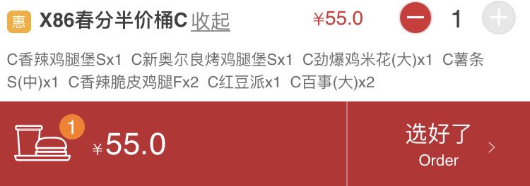C: 香辣鸡腿堡1个 新奥尔良烤鸡腿堡1个 劲爆鸡米花(大) 1份 香辣脆皮鸡腿2个 红豆派1个 薯条(中) 1份 百事可乐(大) 2杯!使用有效期: 2019年3月16日-2019年3月20日!