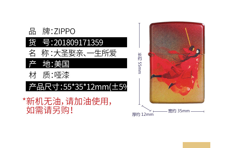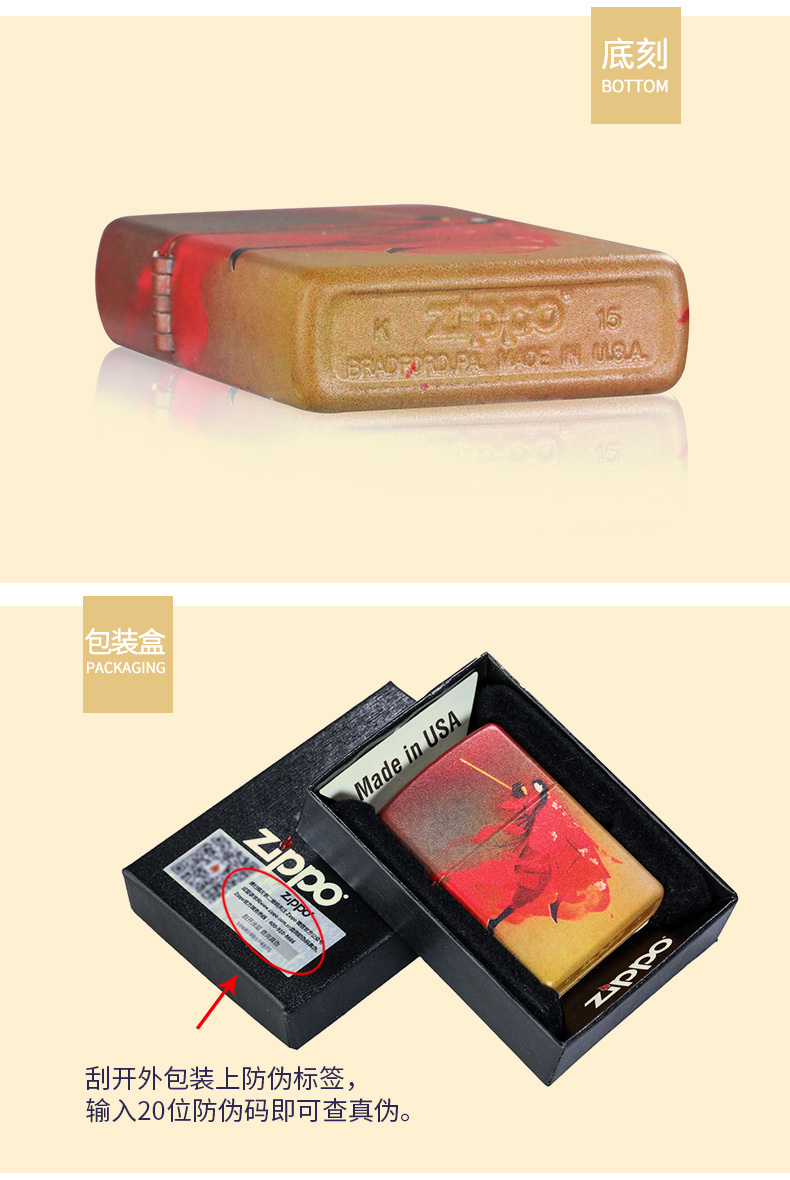 这款Zippo 一生所爱彩印防风打火机,以星爷的神作《大话西游》为主题,美国原产(火机底部印有made in USA),刮开外包装上的防伪标签,在官网上输入20位防伪码即可验证真伪。