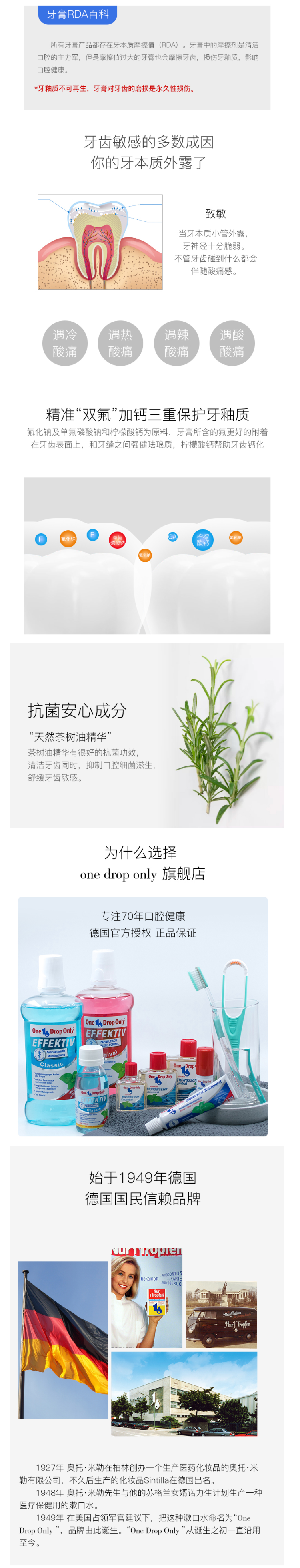 这款OneDropOnly舒敏抗菌牙膏,德国原装进口,天天草本植物配方-茶树精油、春黄菊花、辣薄荷等植物精华成分,清新口气温和不刺激,富含细小去污微粒子,通过温和摩擦减少去除牙齿上的牙菌斑、茶渍、烟渍等顽固污渍。