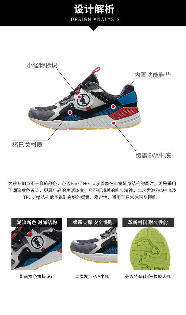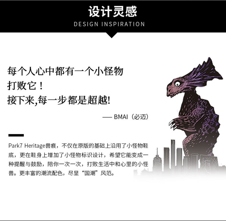 这款必迈 Park7 H兽痕是2019年的秋季最新款,是在Park7 Heritage的基础上进行了升级和改良,鞋身的结构更加丰富,在上面也增加了小怪物标识。